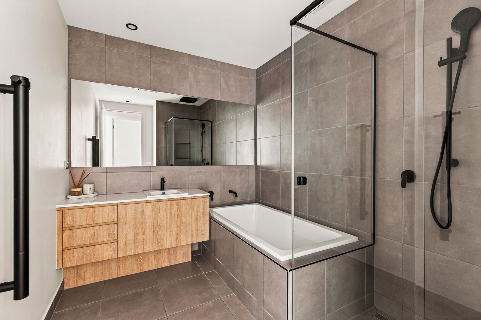 Main Bathroom: In-built tub, oversized single vanity with underbench storage and stone benchtop, large wall mirror, heated towel bars, shower with rail head and tiled base, and separate powder room.