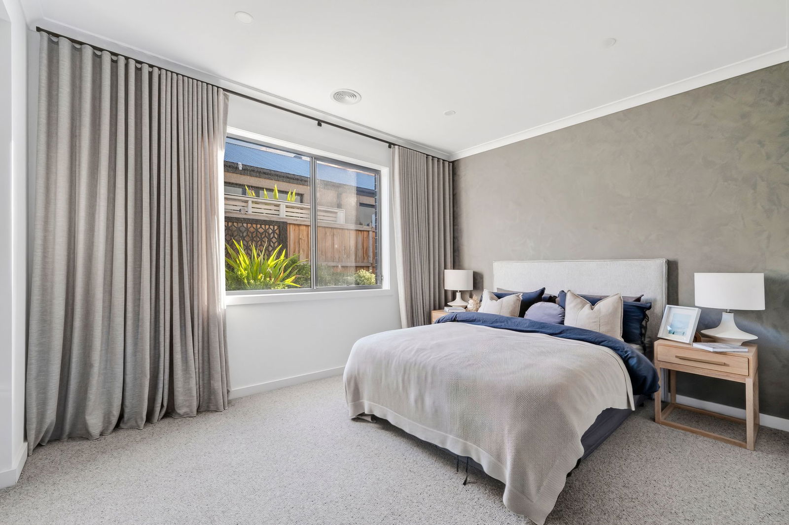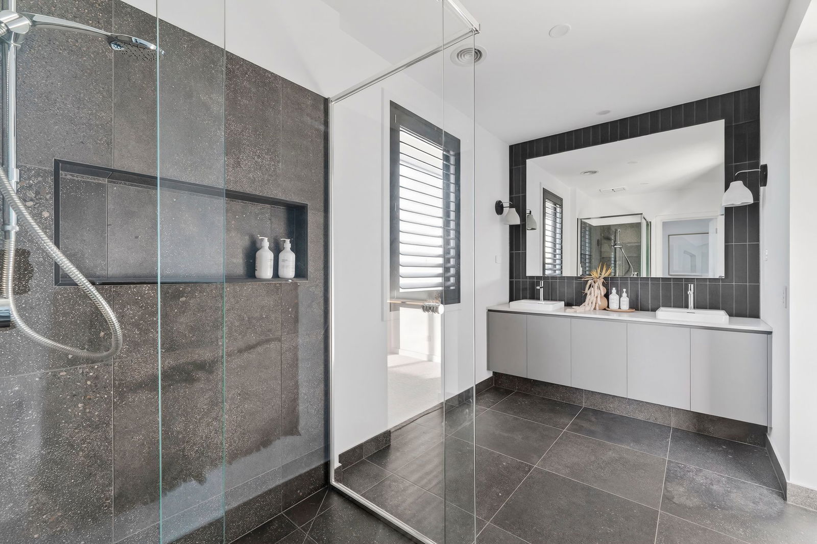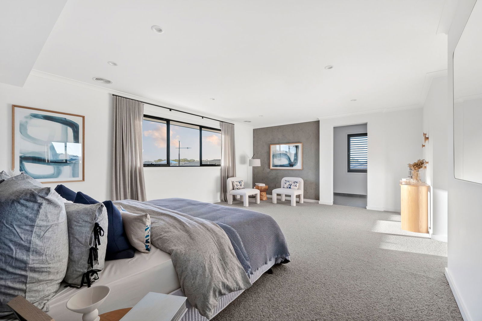 Master Suite: A truly oversized retreat featuring a concrete-look feature wall, soft sheers, plantation shutters, and a luxurious ensuite with dual vanity, dual feature lighting, spacious shower with oversized nook, and separate toilet. The walk-through robe offers ample storage on both sides, completing a master wing designed for indulgent everyday living.