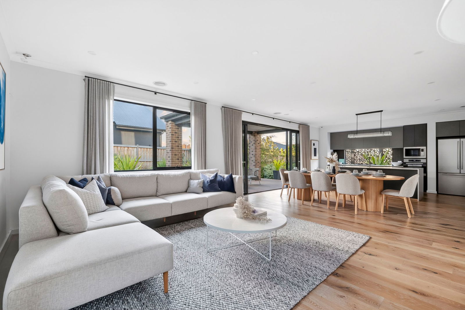 Front Living Zone: Light-filled and welcoming with generous proportions, downlights, sheer curtains, and a concrete-look feature wall creating a bold yet refined first impression.