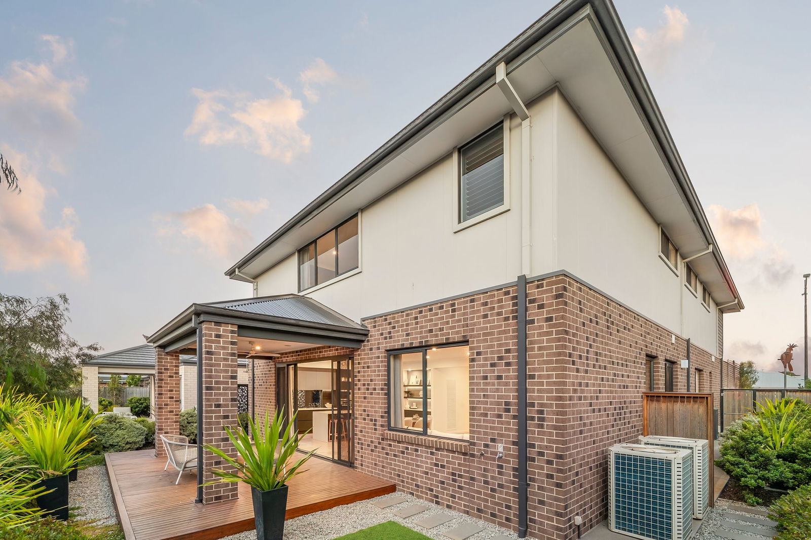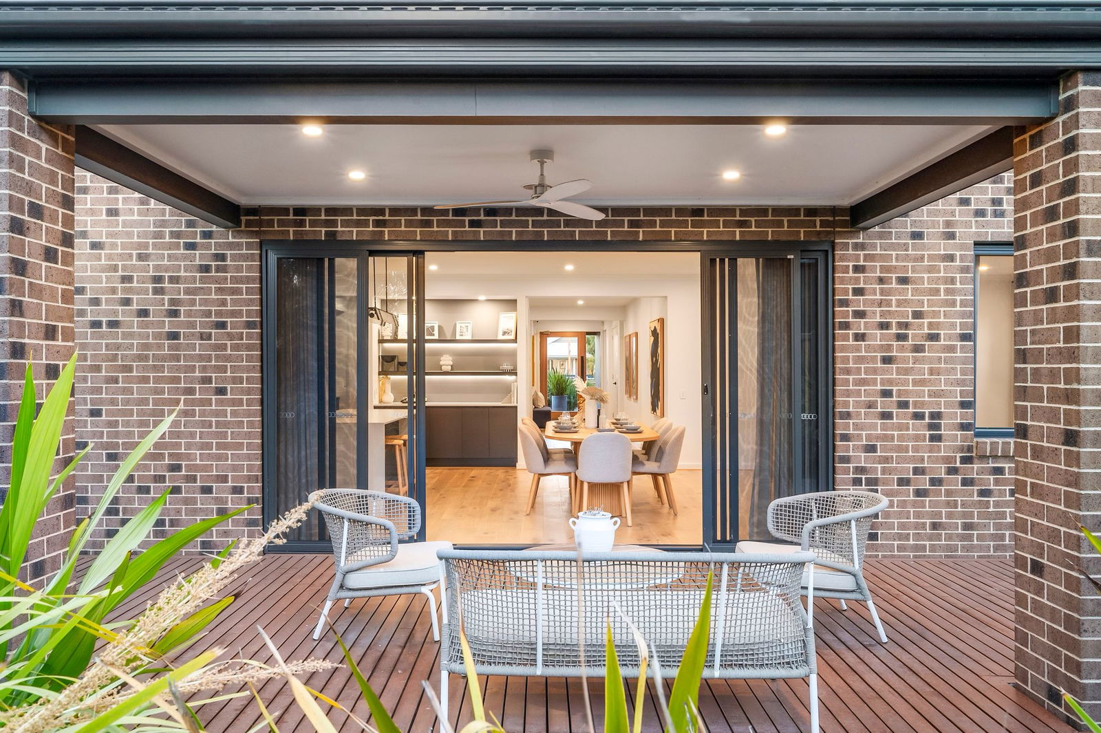 Indoor-Outdoor Connection: Stacker doors extend the main living zone to a large undercover deck, enhanced by an outdoor ceiling fan, quality artificial turf, and low-maintenance concrete pathways along both sides.