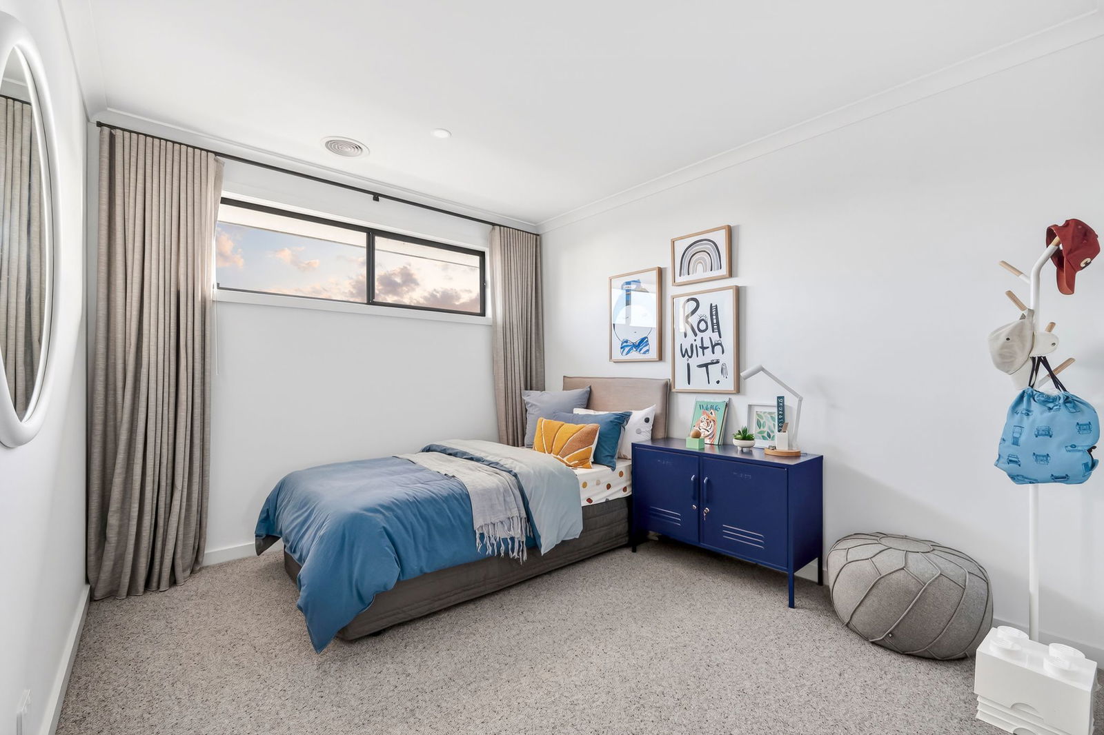 Upstairs Living Zone: A second open-plan lounge positioned at the front of the home, filled with natural light through large windows and softened by sheer curtains – an ideal breakout space for kids, relaxation, or a retreat upstairs.
