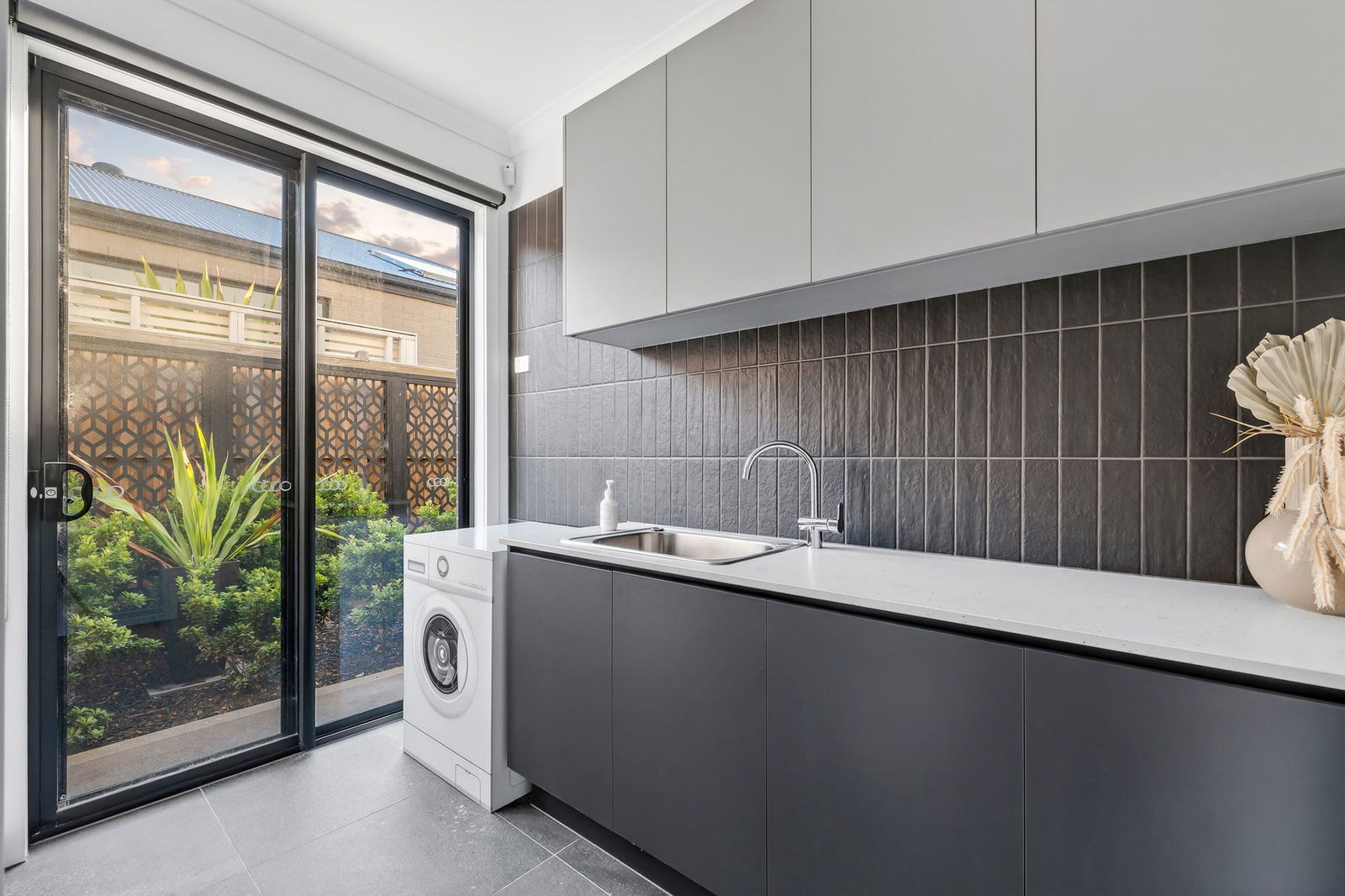 Laundry: Thoughtfully designed with a large sink, feature tiling, overhead storage, stacking space for washer and dryer, walk-in linen press, and sliding door access to the side yard.