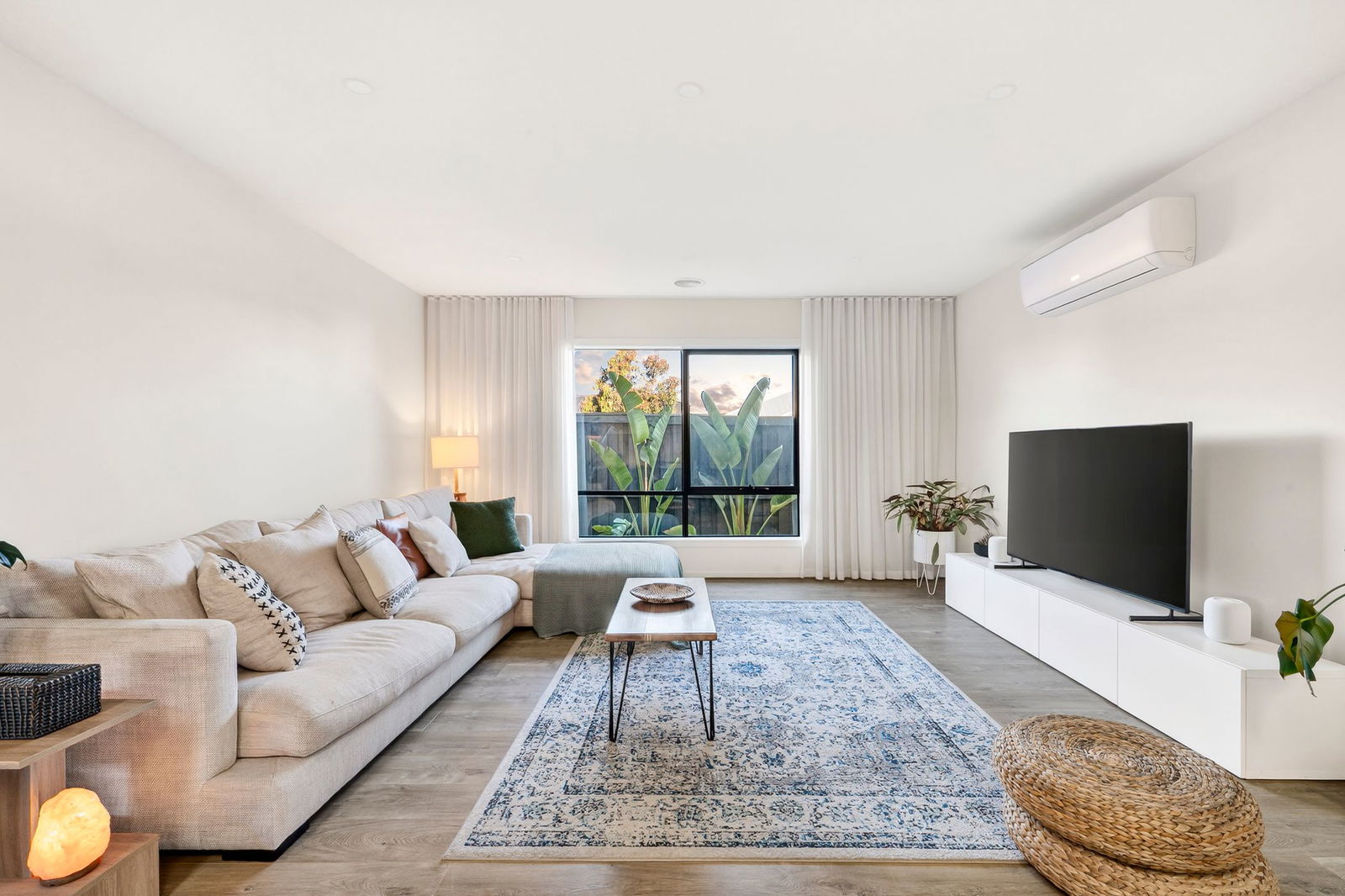 Open Plan Living/Dining: Modern floors, downlights, split-ceiling heights with lowered living room ceiling, window with sheer curtains, soft morning sunlight fills the living space, split-system heating and cooling unit, and square-set cornice.