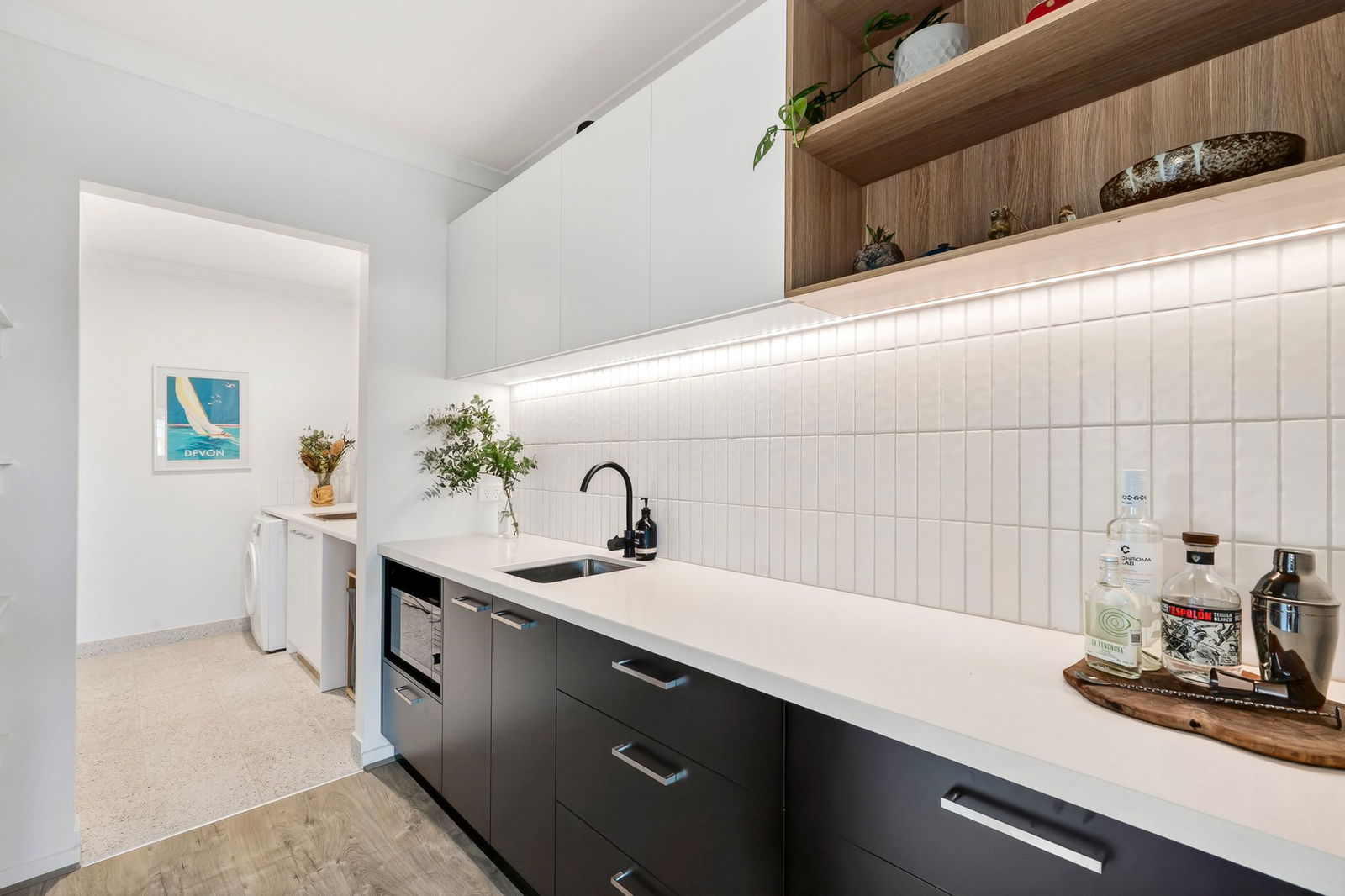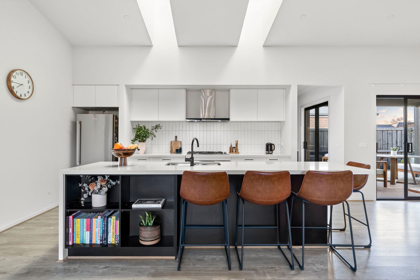 Kitchen: Extensive waterfall island bench with 40mm stone, storage and breakfast bar overhang, plumbed fridge cavity with overhead cabinetry, 900mm Westinghouse gas cooktop and underbench oven, canopy rangehood, tiled splashback, stone benchtops, bin drawer, Bosch dishwasher, dual in-set sink, and butler’s pantry with secondary sink, sliding door access to alfresco, overhead cabinetry, open shelving, and direct laundry access.