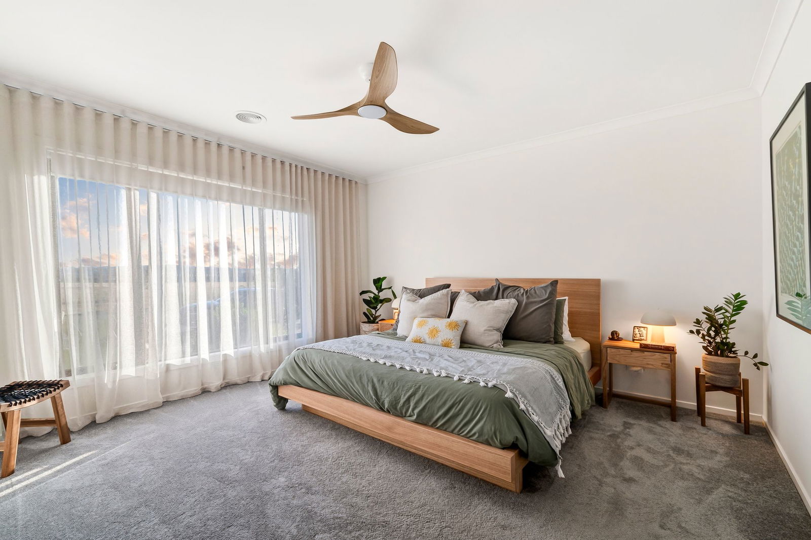 Master Suite: Large front-facing window with roller blind and sheer curtain, carpet underfoot, ceiling fan with light, and walk-through ensuite with robe access, large shower with dual head and wall niche, single vanity with extended bench and ample underbench storage, and private toilet.