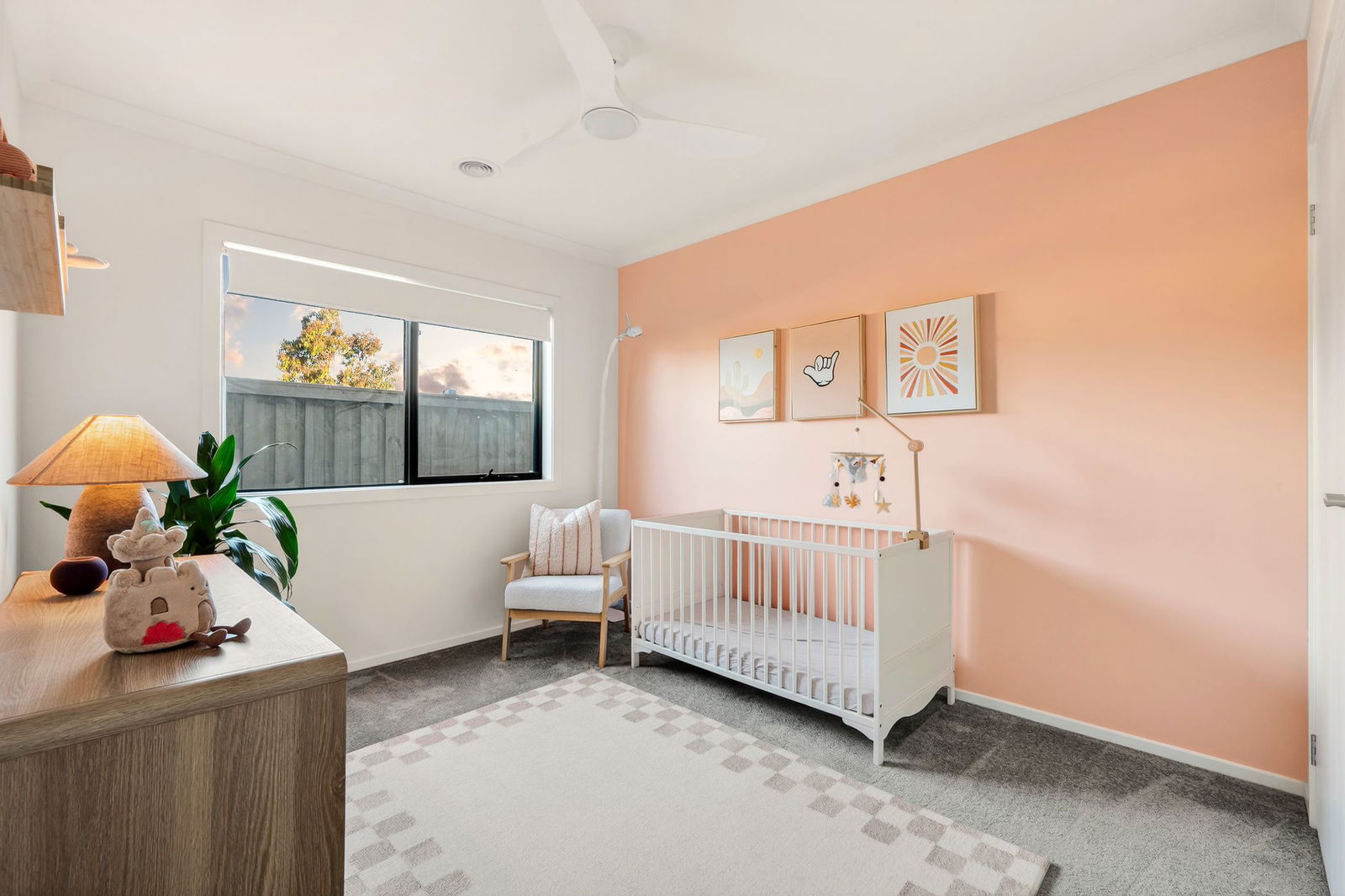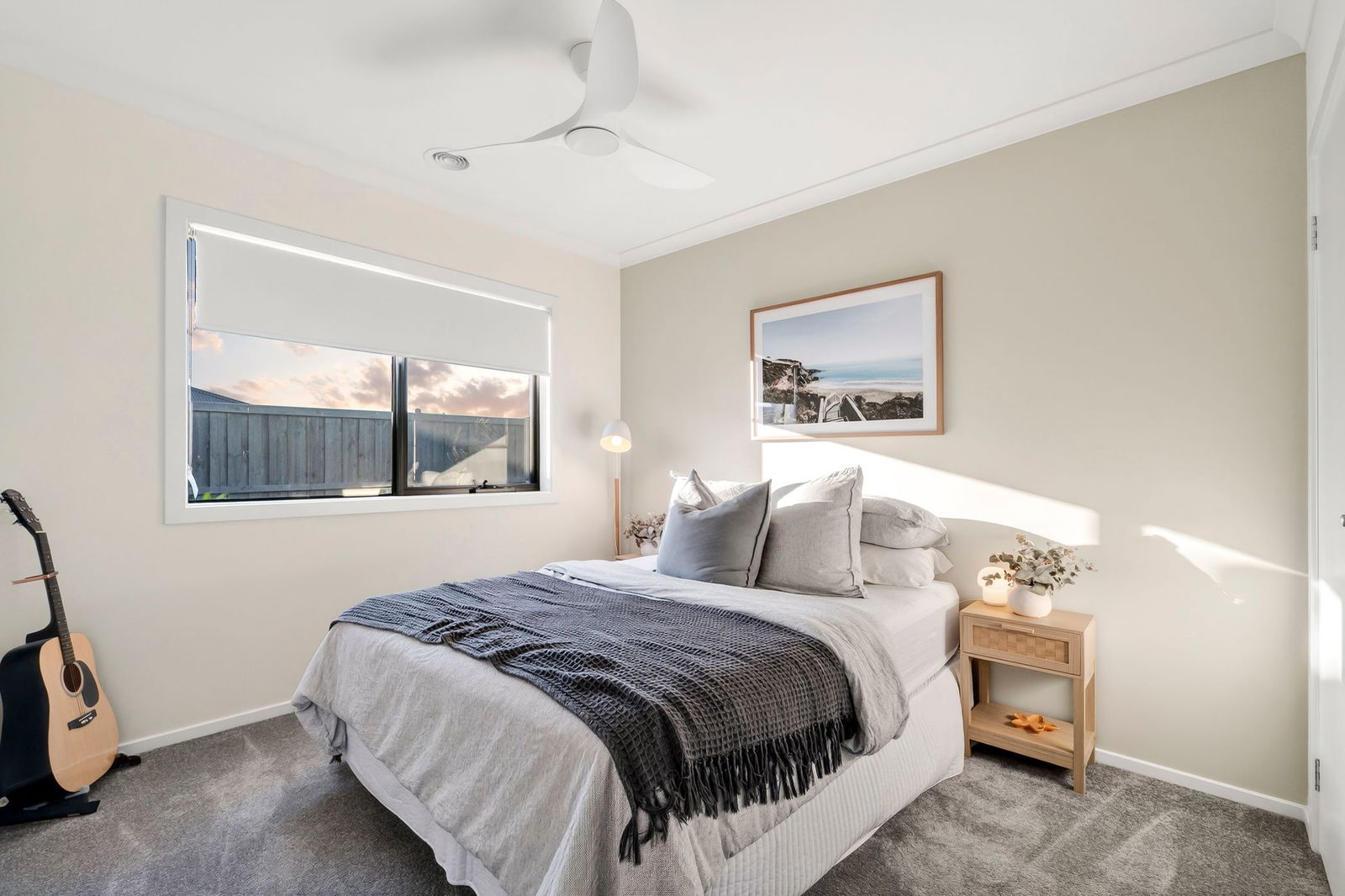 Additional Bedrooms: Two, both sharing in built-in robes, a ceiling fan with light, window with roller blind, and carpet underfoot.