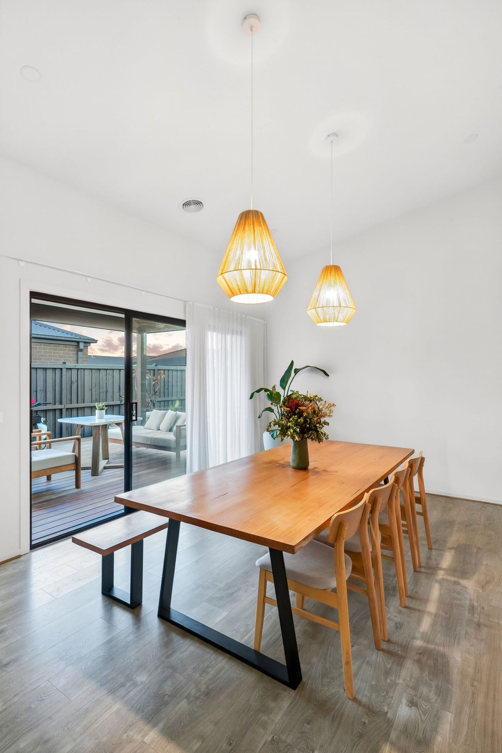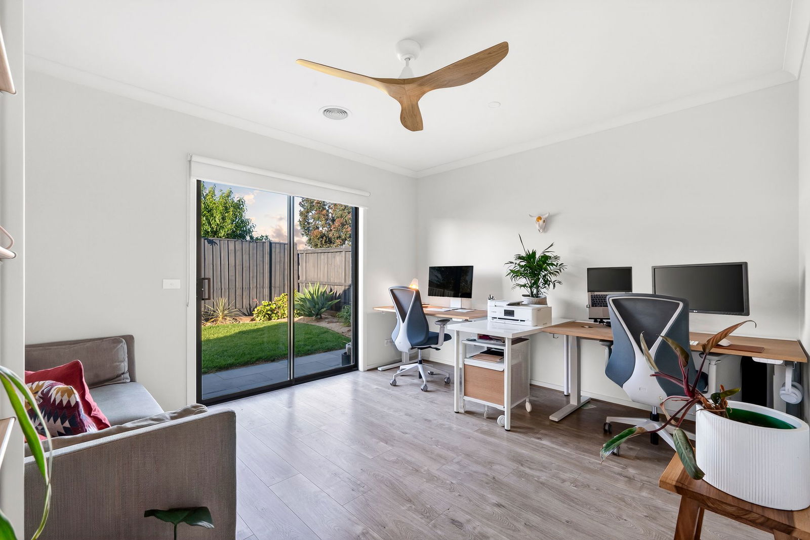 Secondary Living: Modern floors, ceiling fan, rear sliding door access, and roller blind.