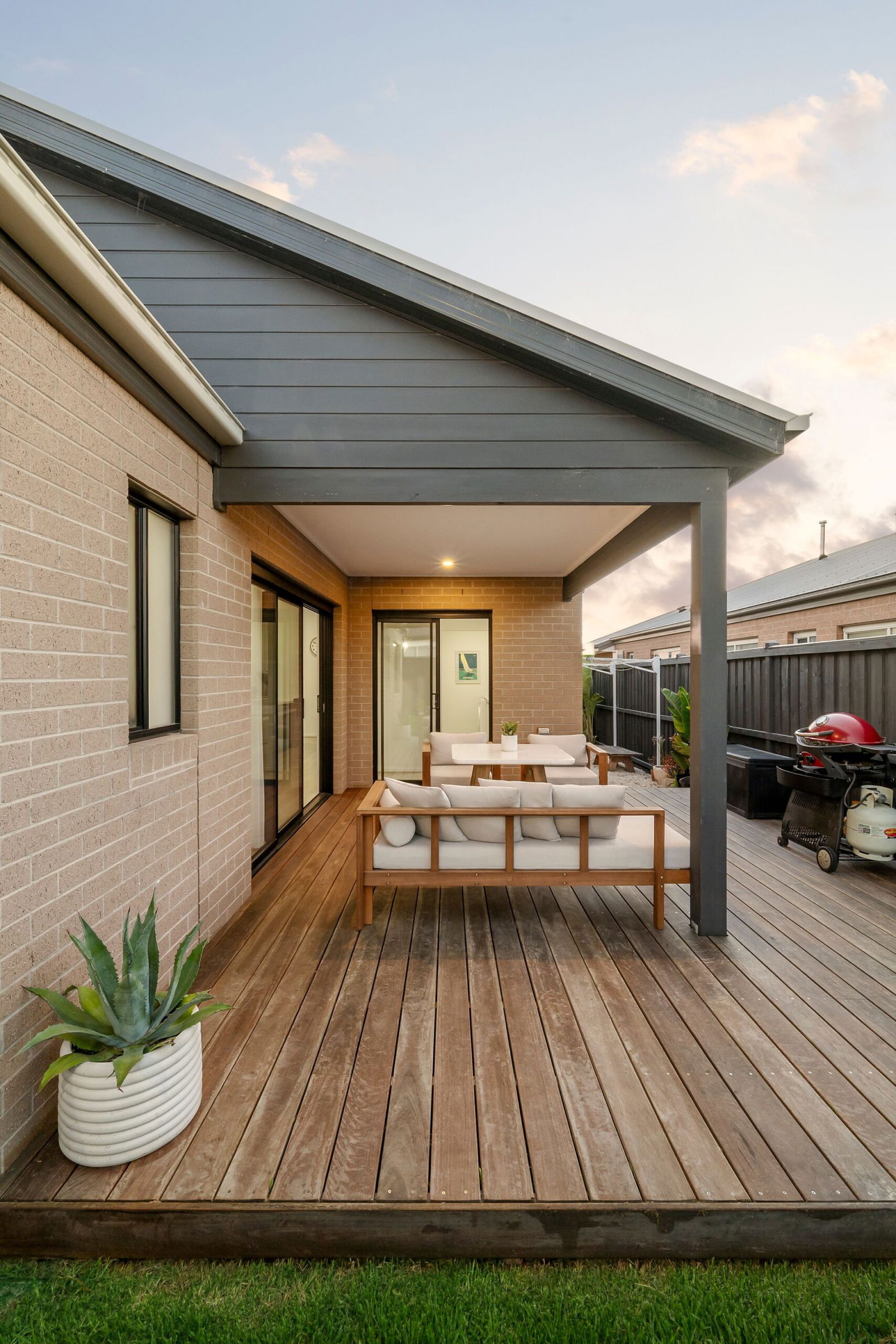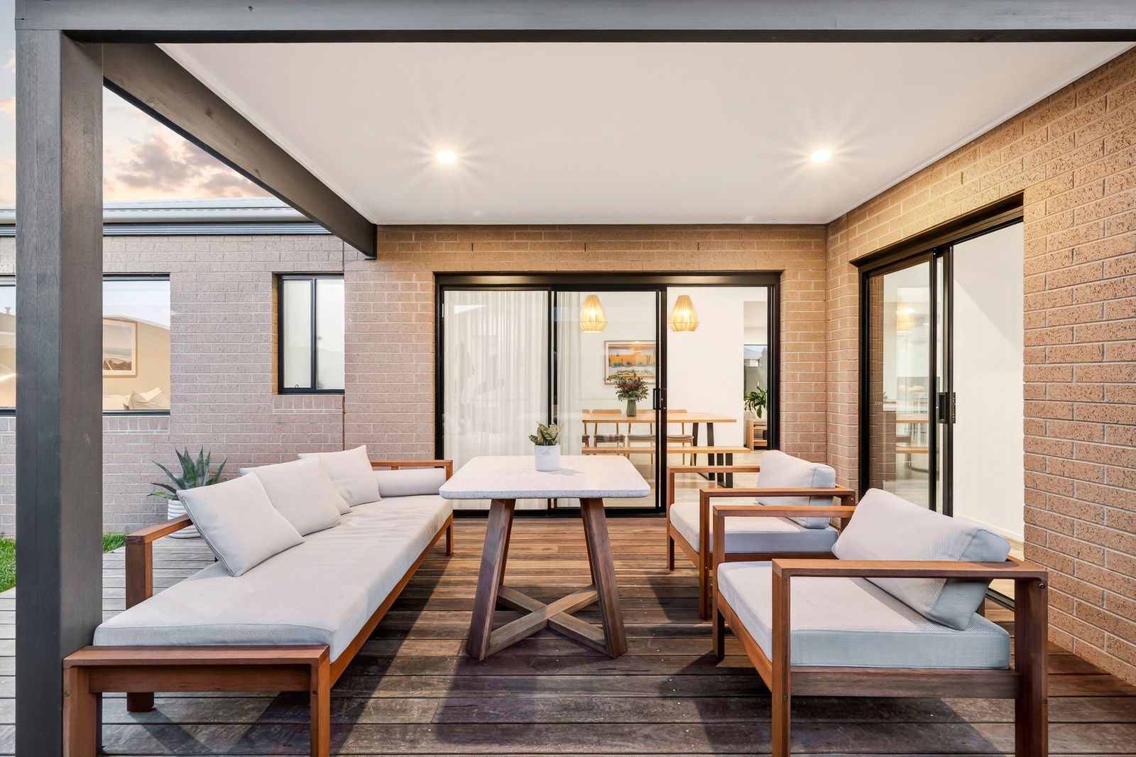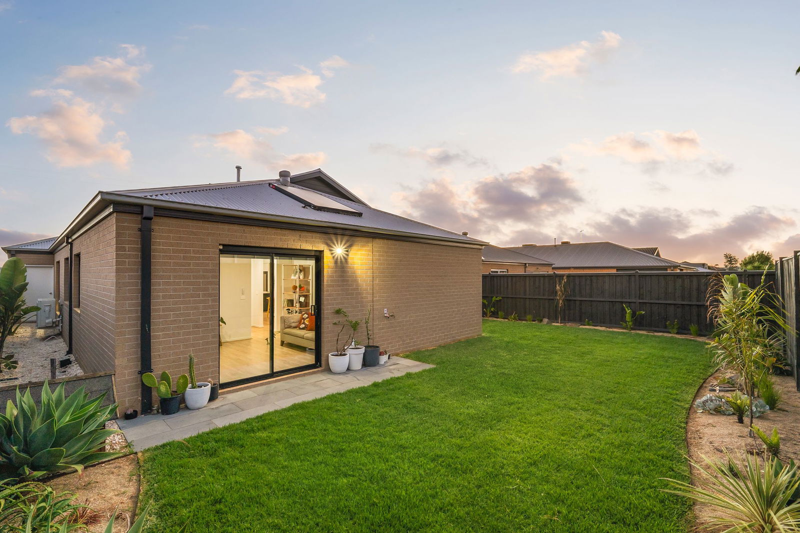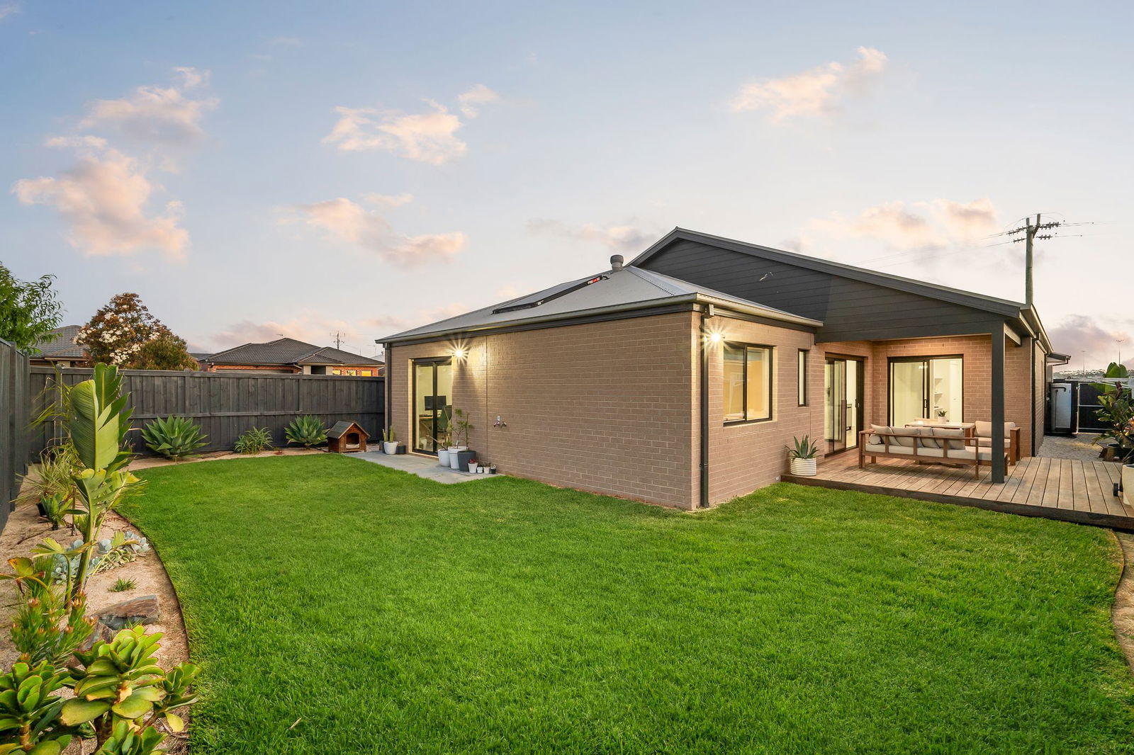 Outside: A covered alfresco extends to a sun-drenched deck, spilling to the rear yard where a perimeter resort-style garden frames an open grassy play space, including spotlights to the alfresco and rear yard. A side service area includes a clothesline, while to the front, established gardens soften an exposed aggregate driveway and double garage.