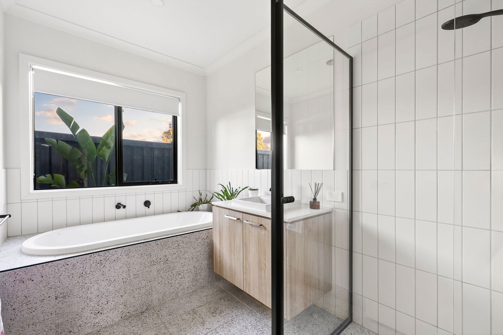 Main Bathroom: Bathtub with tiled surround, black tapware, single vanity with underbench storage, wall mirror, and black-framed shower with rail head. Separate toilet.