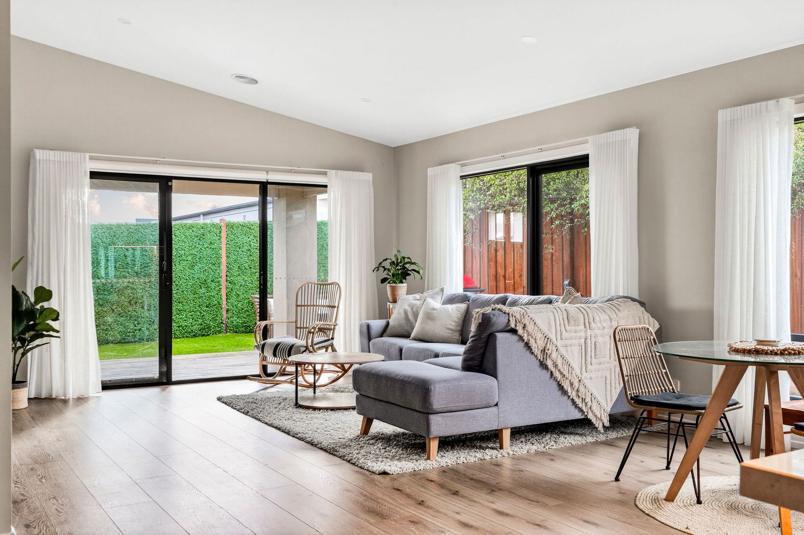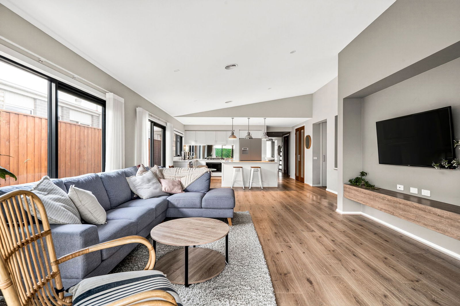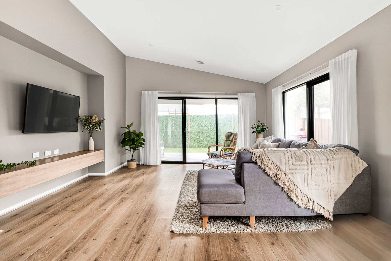 Living/Dining: Modern floors, open dining space, windows with sheer curtains, entertainment niche with floating unit, raked ceiling with downlights, rear sliding door with sheer curtains.
