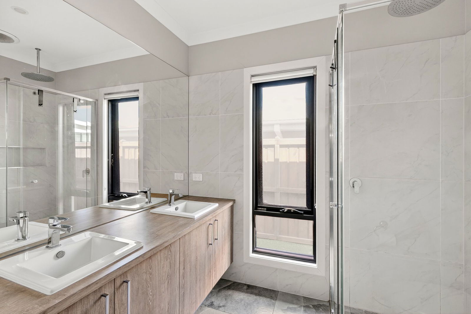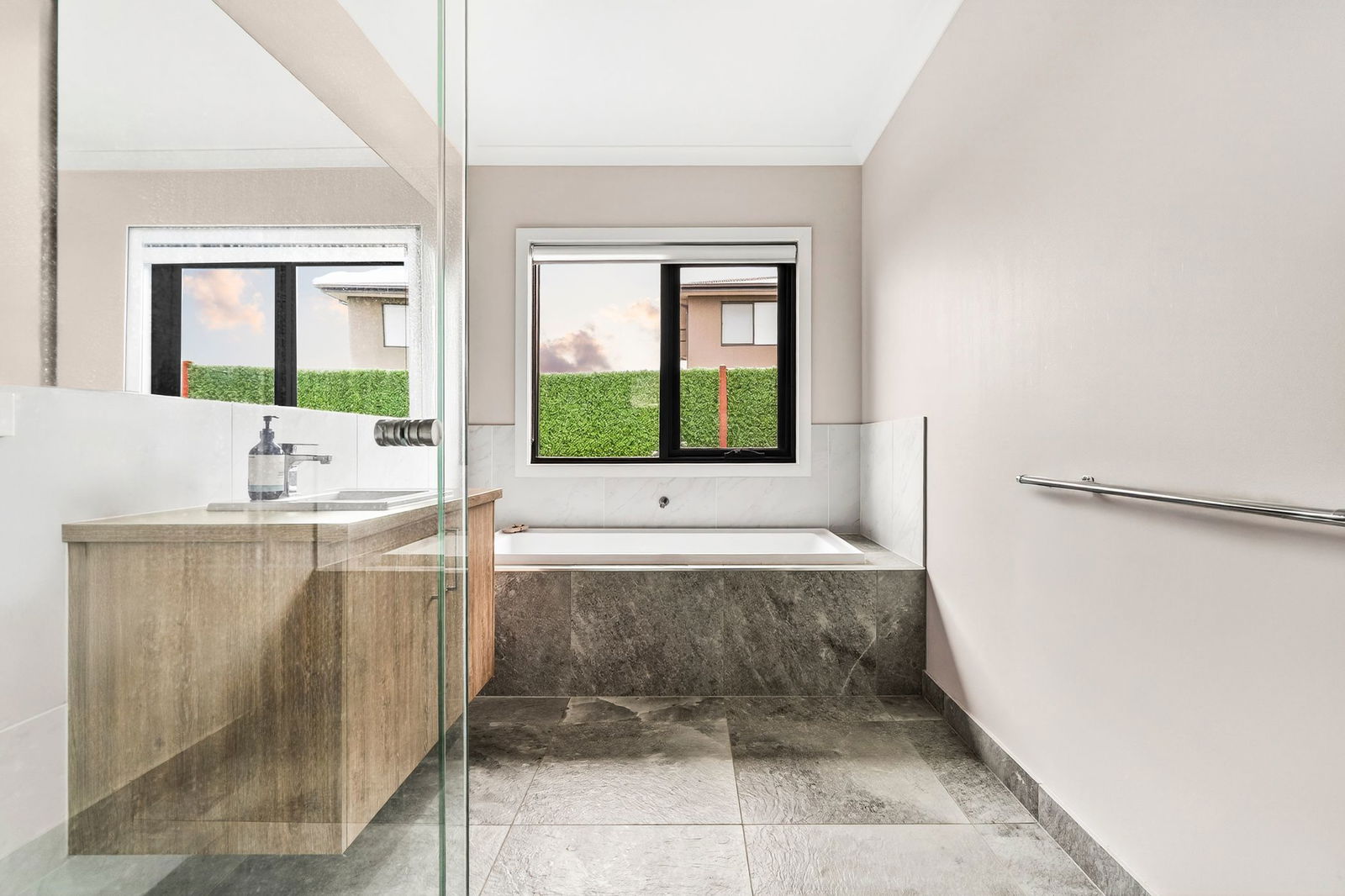 Main Bathroom: Built-in tub beneath window, large wall mirror, single vanity with underbench storage, chrome tapware, shower with ceiling-mounted head and tiled base, and separate toilet.