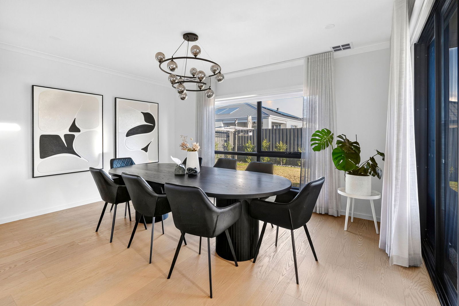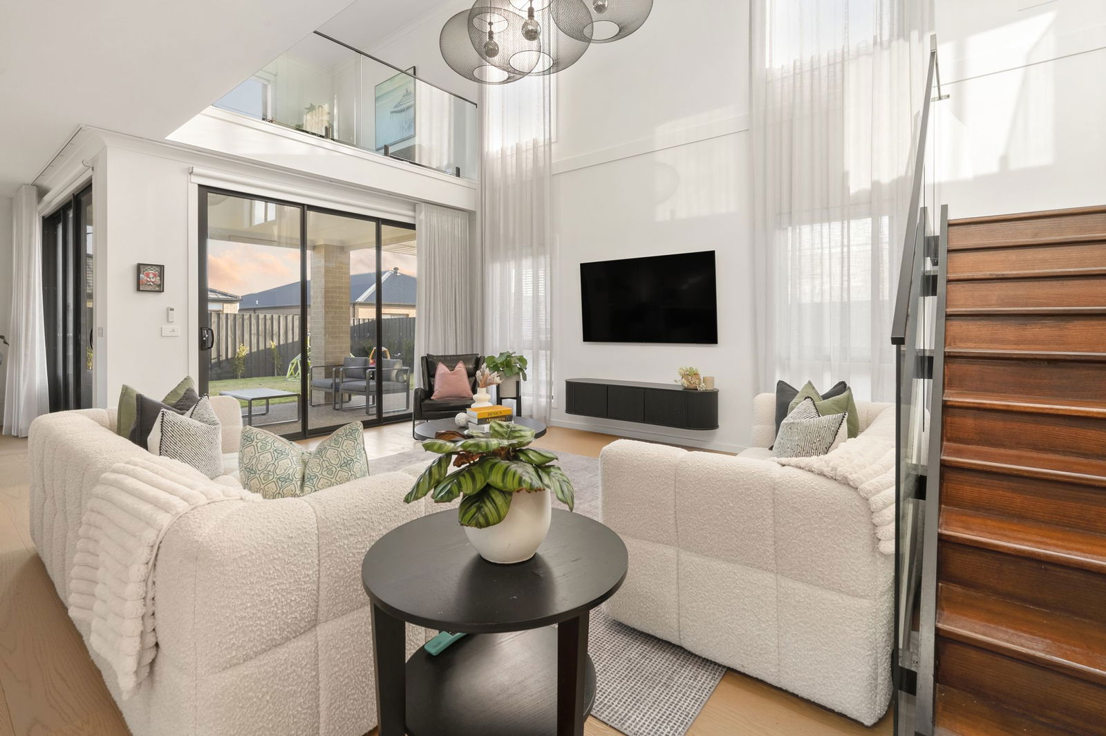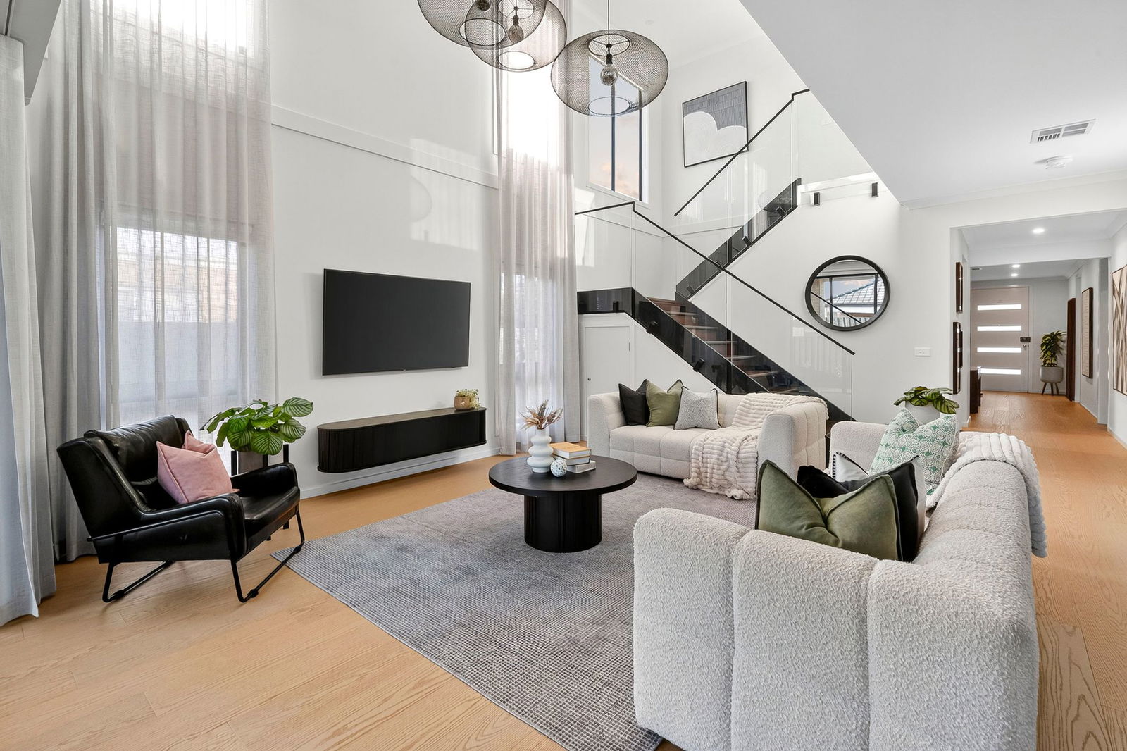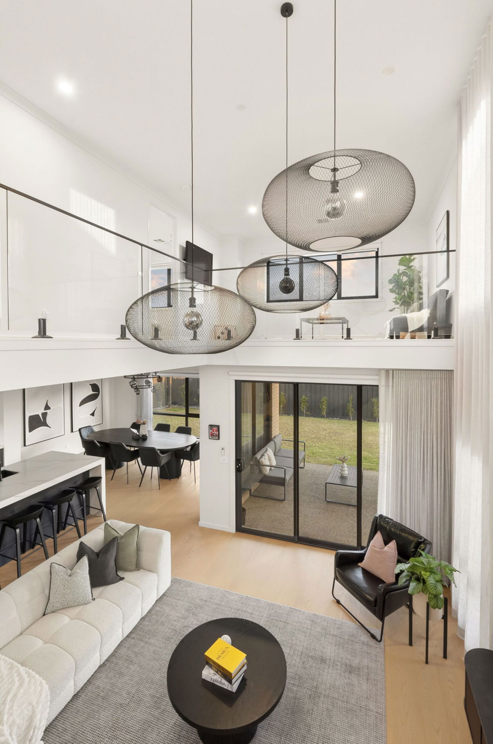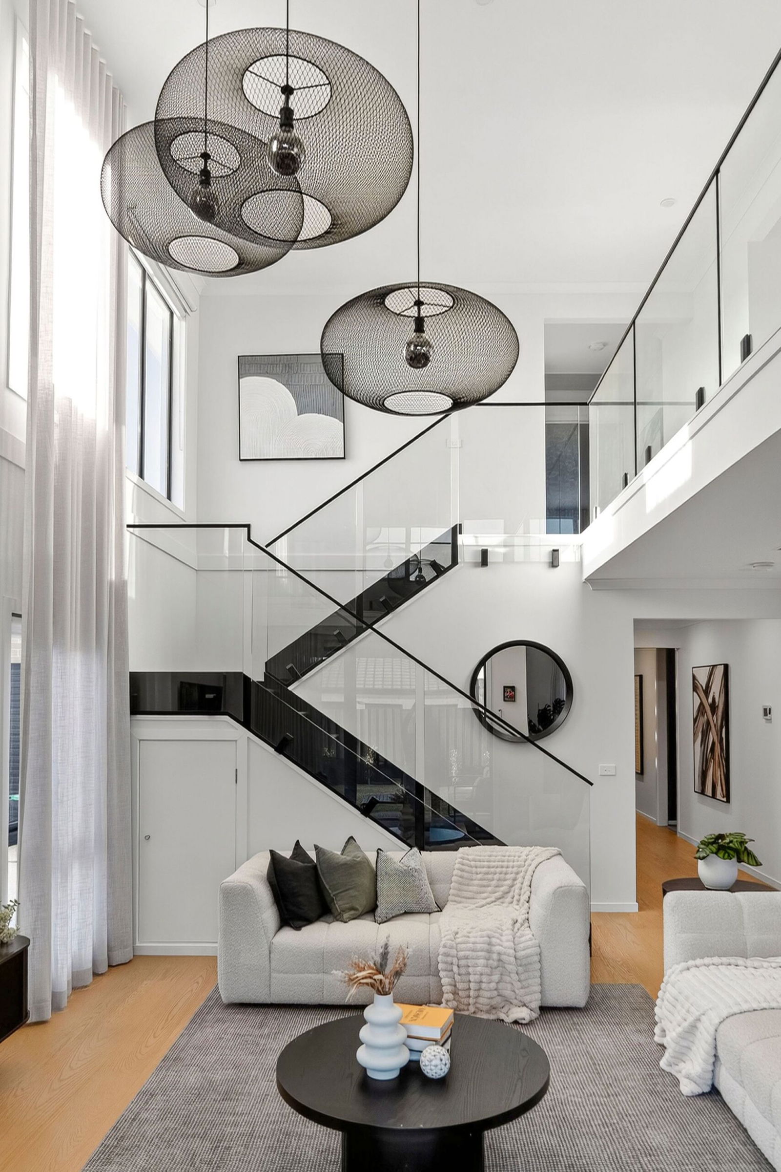 Living & Dining: A spacious open-plan design with a dedicated dining area, engineered timber floors, and a dramatic open void is complemented by 2590mm high ceilings that enhance the sense of space. Statement pendants, floor-to-ceiling sheers, block-out blinds, downlights, and a feature glass staircase create a sophisticated yet inviting atmosphere.