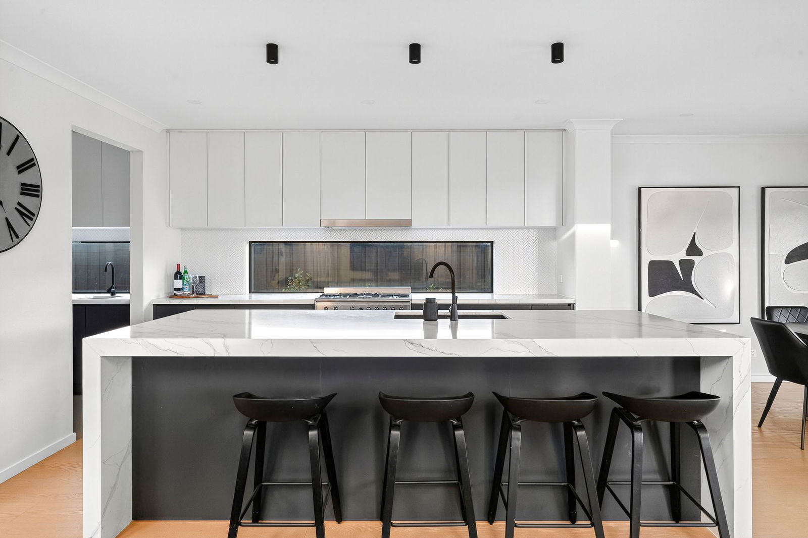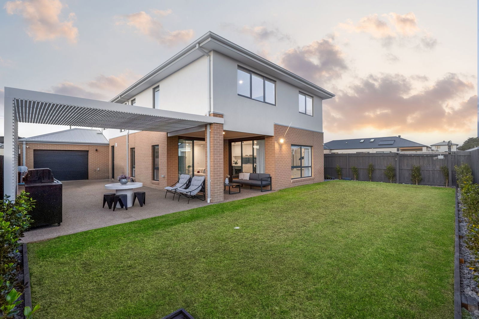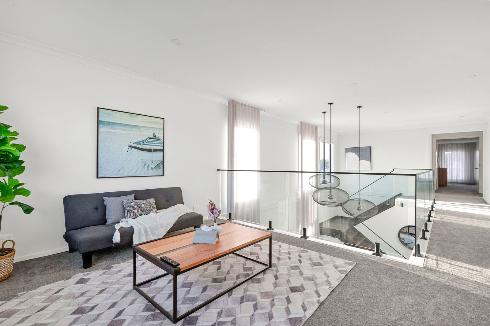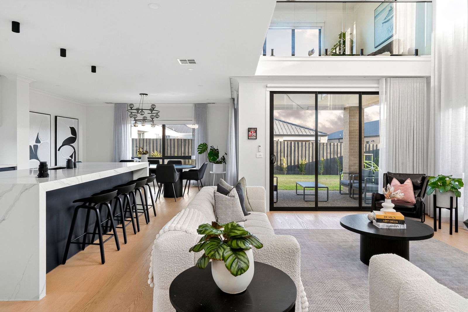 Flooded with natural light and enhanced by soaring ceilings, floor-to-ceiling sheers, and an open void, the home feels expansive yet inviting. From the timber and glass feature staircase to the guest suite downstairs and multiple living zones, every detail has been carefully considered to create a refined lifestyle in a sought-after Mount Duneed pocket.
