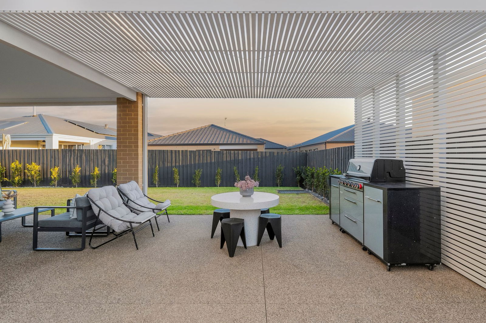 Outdoors: Spacious undercover alfresco flows seamlessly from the main living, complemented by low-maintenance surrounds and spacious grassed areas for play. A feature open pergola creates a beautiful statement piece, while exposed aggregate concrete provides the perfect space for parking boats, cars, or caravans. Wide drive-through access completes the functionality.