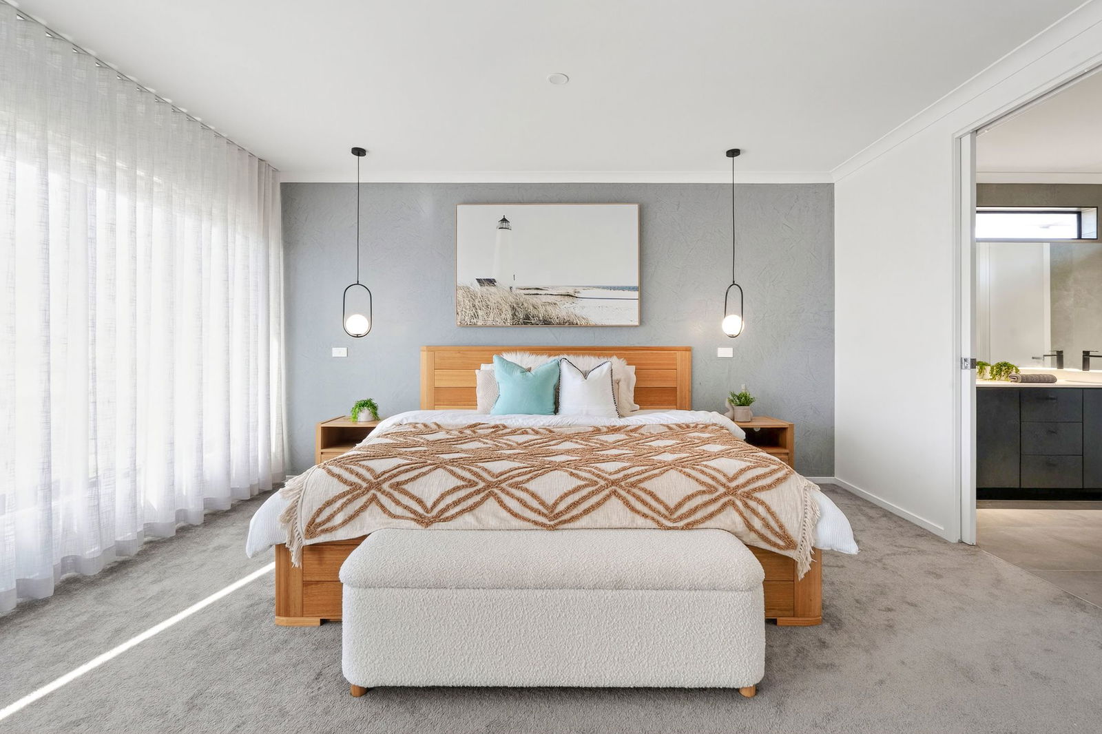 Master Bedroom: An oversized retreat with a feature wall, pendant lighting, and cavity sliders to the ensuite. Complete with a walk-in robe, double-glazed windows, and sheer curtains, it balances comfort and luxury.