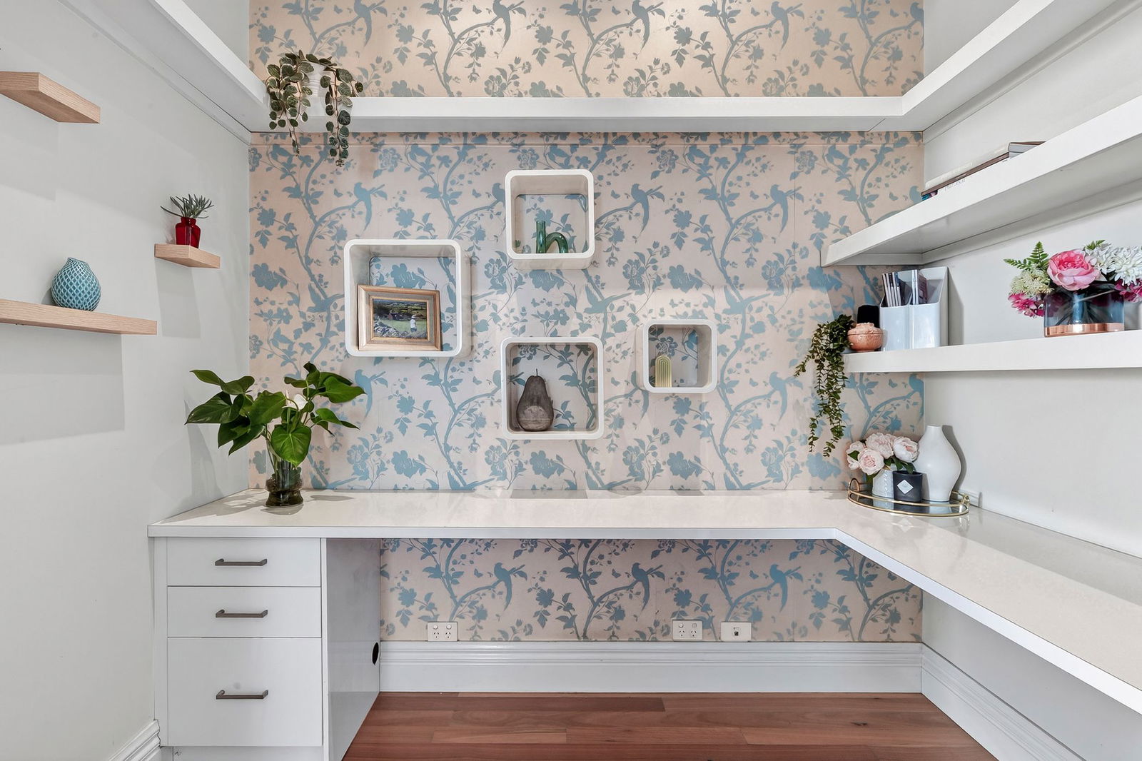 Study Nook – Polished timber floors, bespoke cabinetry, custom shelving & feature wallpaper