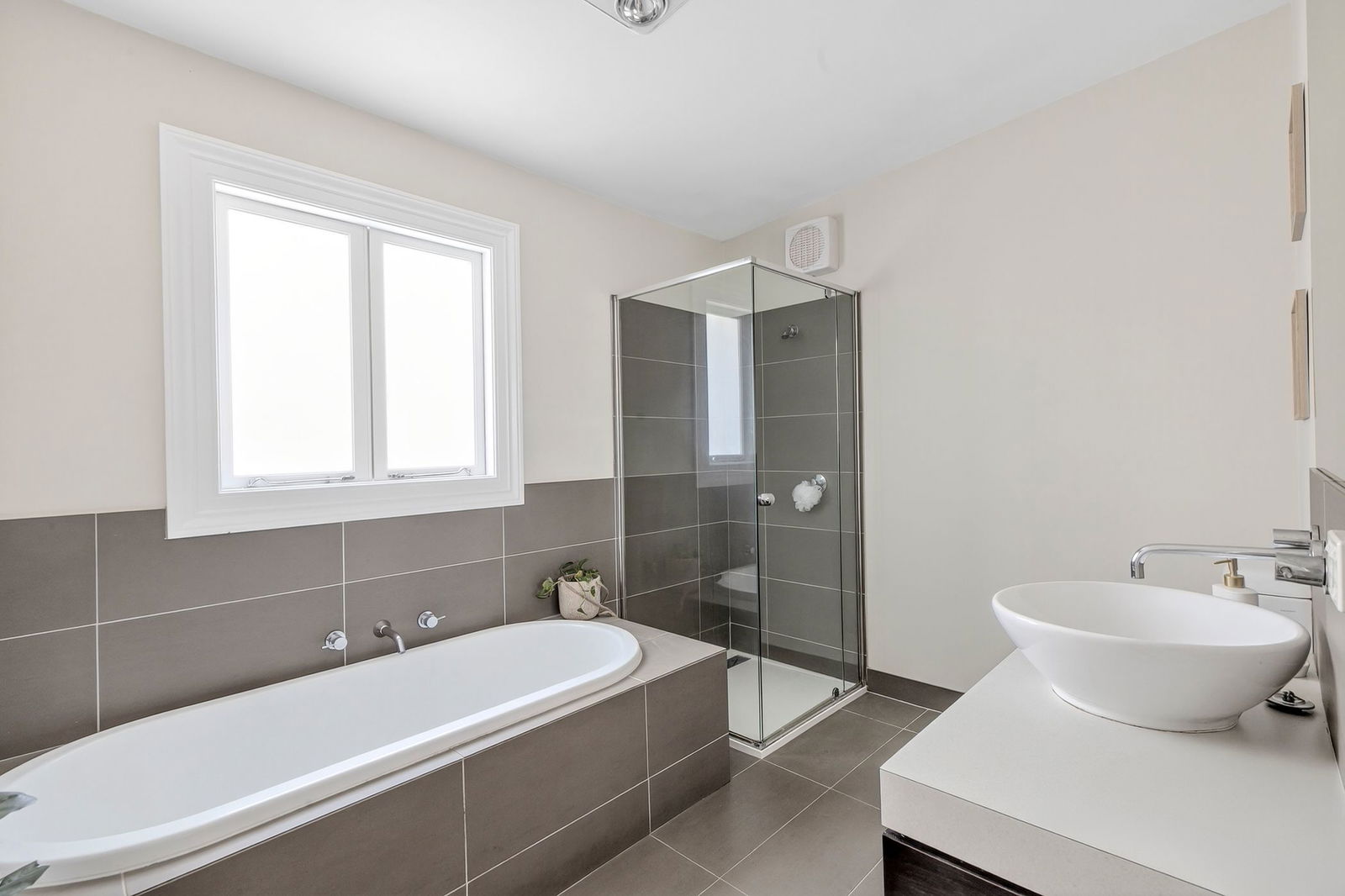 Main Bathroom – Beautifully appointed bathroom with large format tiles, single vanity, mirror, shower, bath & w.c