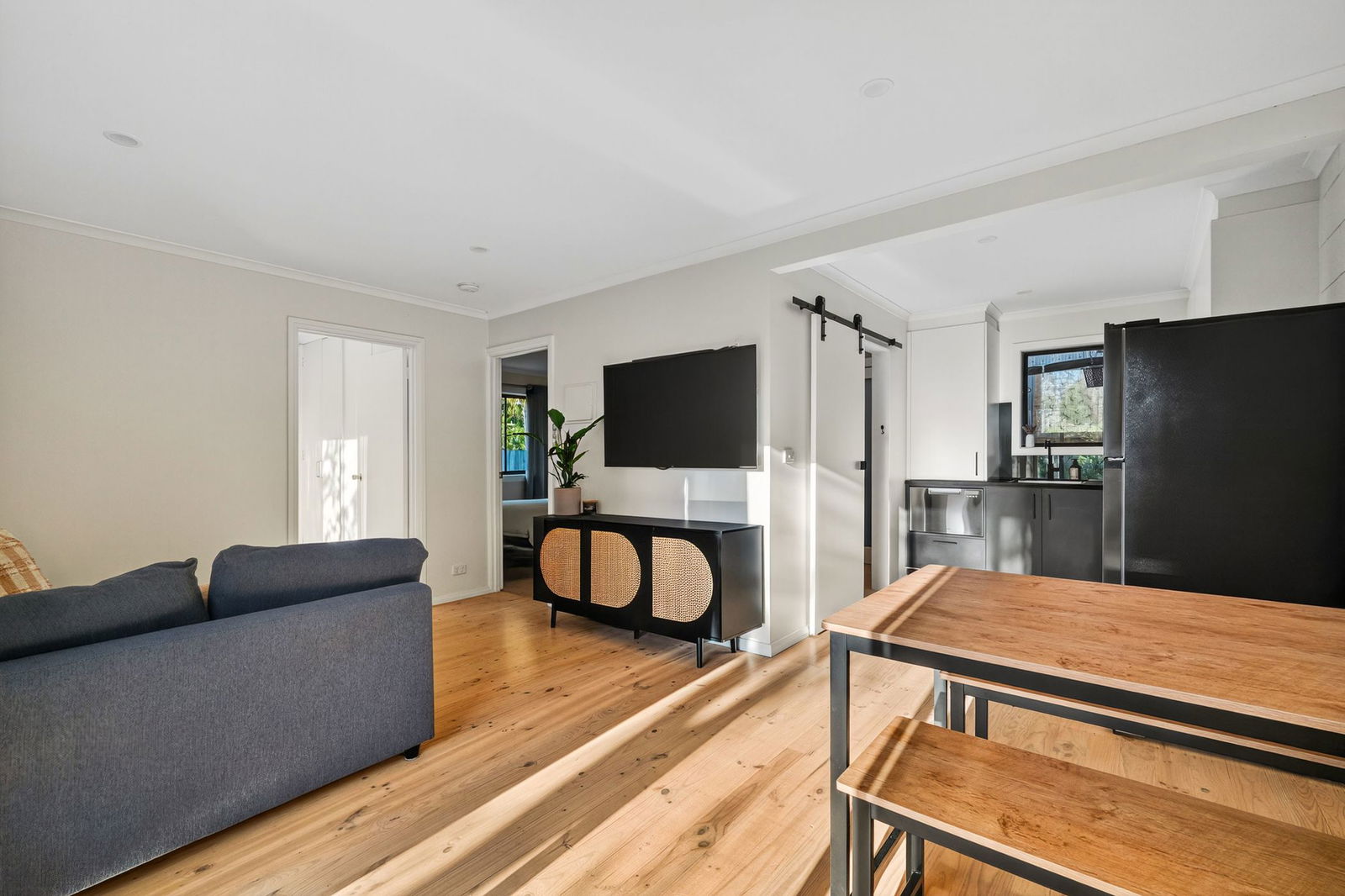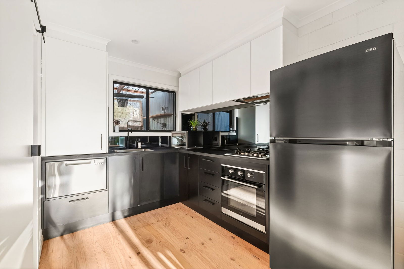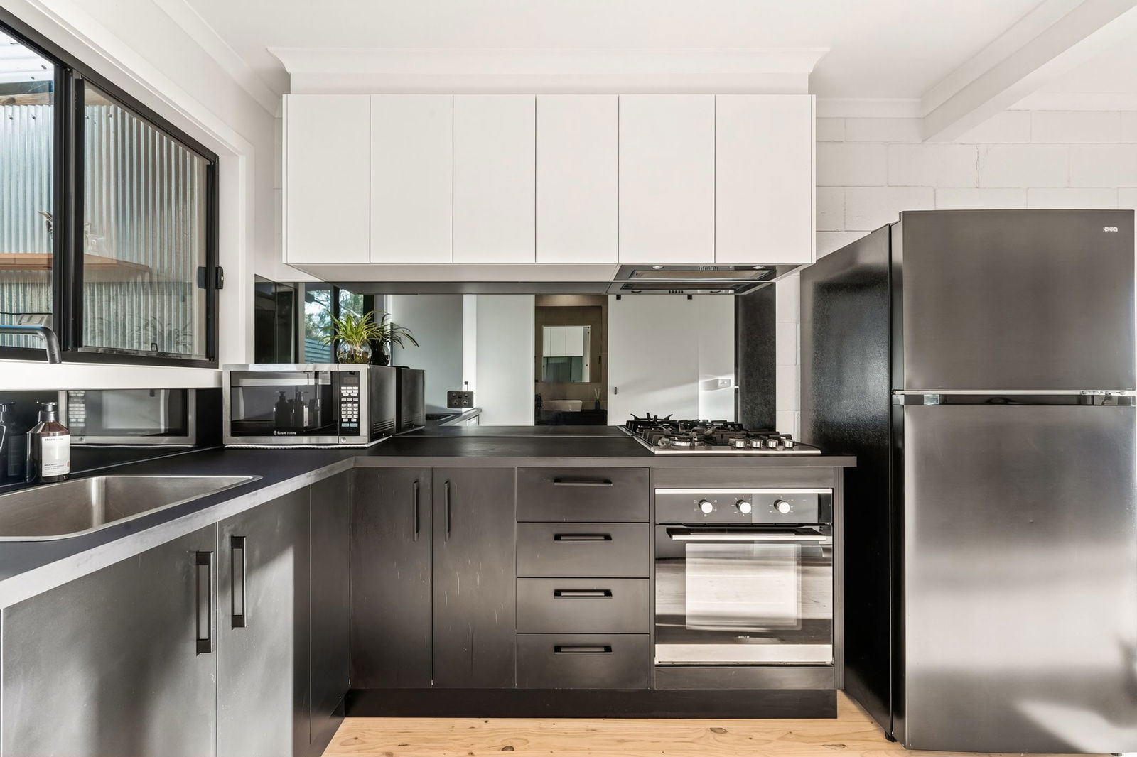 Kitchen: Updated with monochromatic cabinetry, modern underbench oven, 4-burner gas cooktop, single dish drawer dishwasher, mirrored splashback, overhead cupboards with integrated rangehood, black tapware, sliding window to rear alfresco, and feature barn door entry to bathroom.