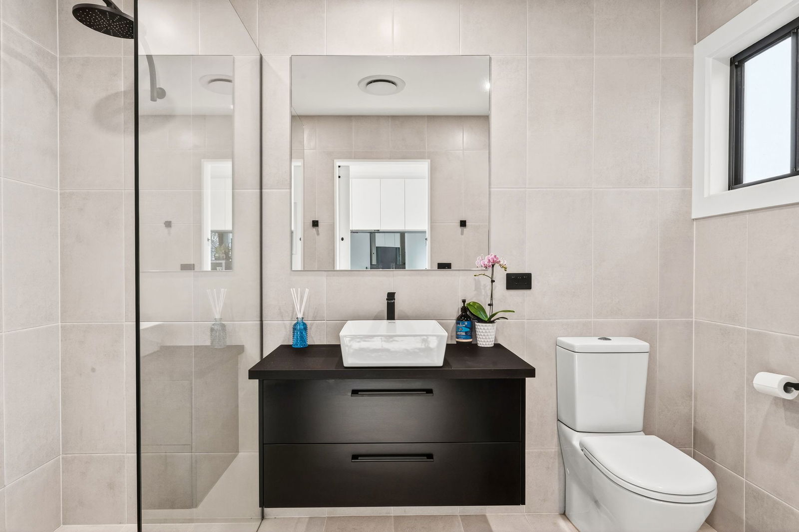 Main Bathroom: Thoughtfully renovated, with full-height tiles, walk-in shower with tiled base, floating vanity with underbench drawers, toilet, black matte tapware, and wall mirror.
