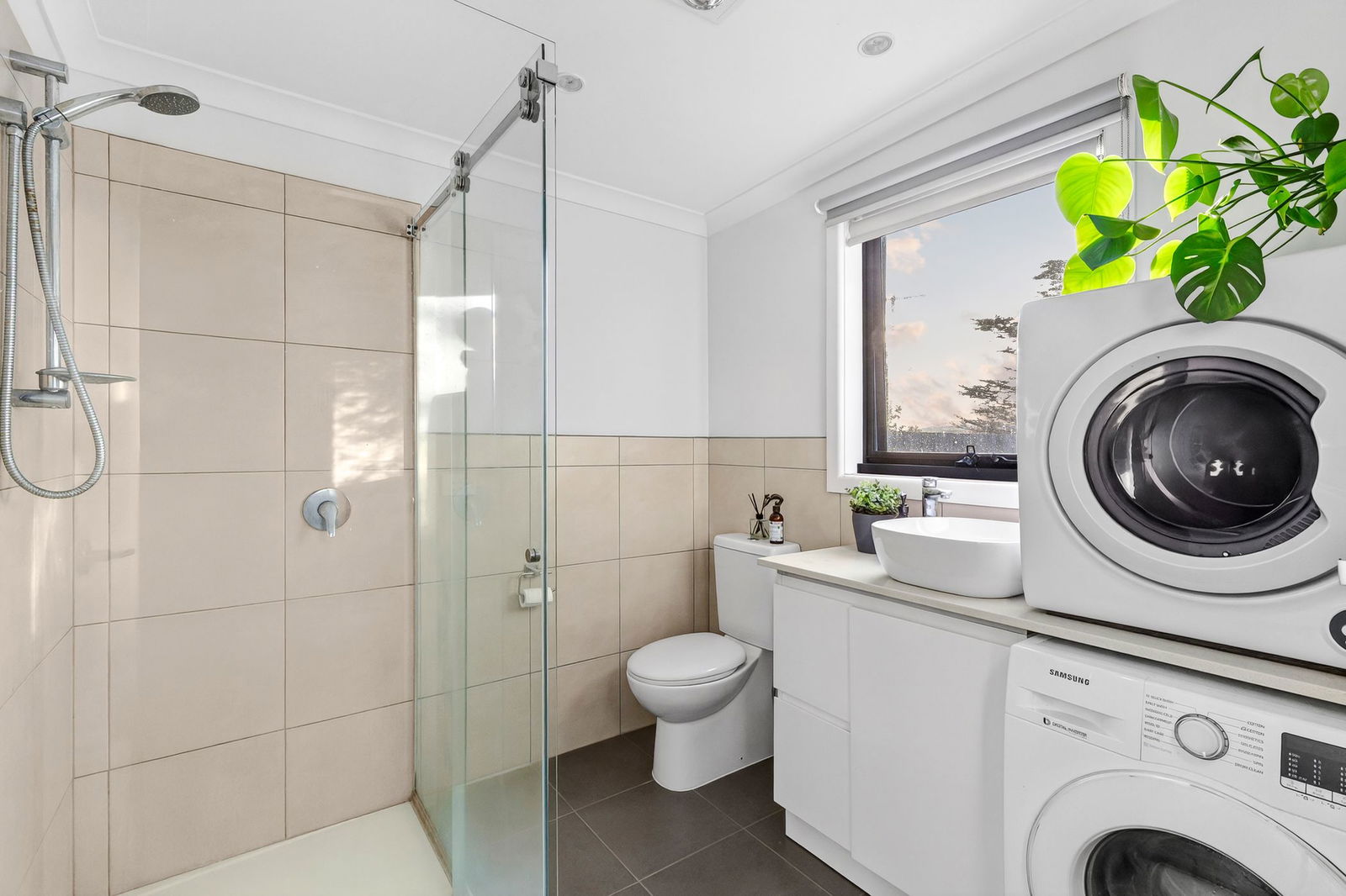 Main Bathroom: Shower with rail head, toilet, window with day/night roller blinds, single vanity with extended stone benchtop, and laundry facilities.
