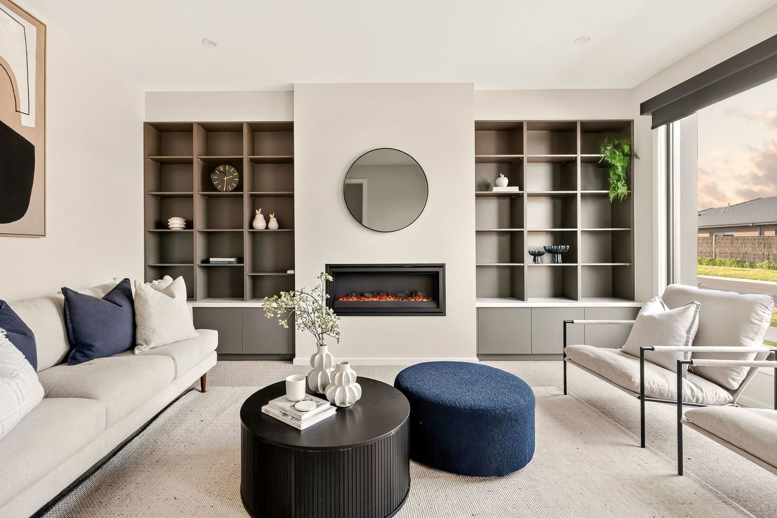 Secondary Lounge: Carpet underfoot, Heat & Glo gas log fireplace, custom joinery with open shelving, large front-facing picture windows, and custom roller blinds.