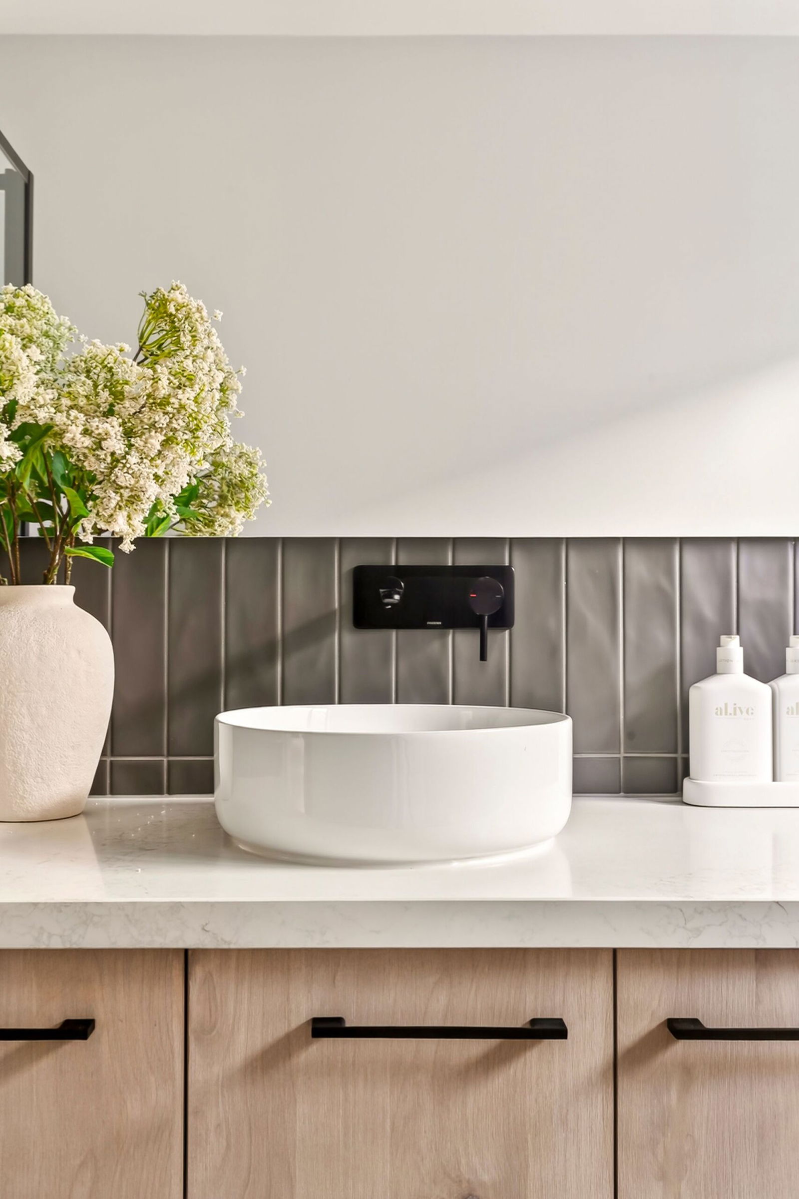 Main Bathroom: Spacious, with freestanding tub, oversized single vanity with underbench storage, shower with dual heads, black hardware and tapware, towel rail, and separate powder room.