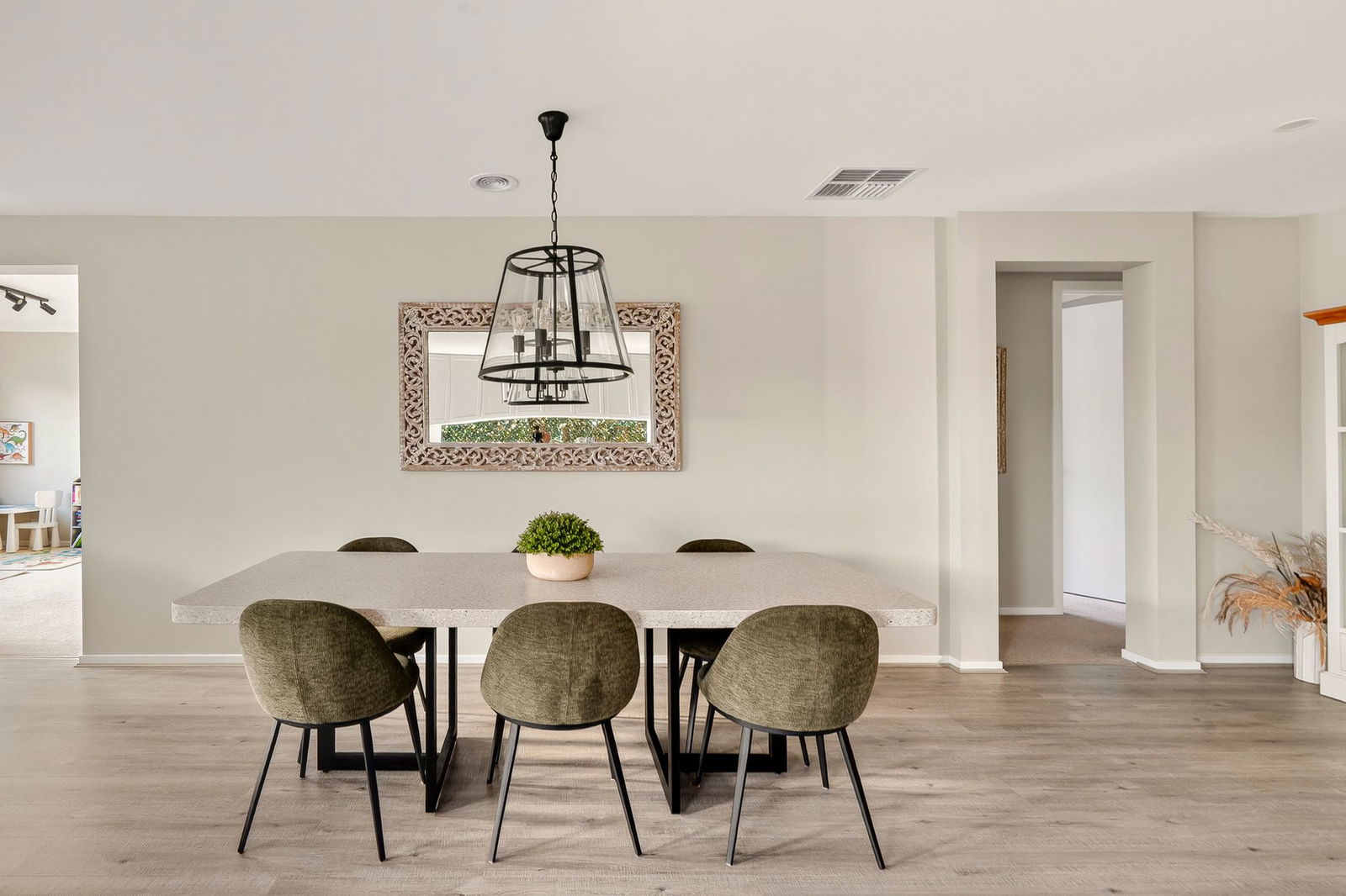 Living/Dining: Expansive proportions, timber laminate floors, downlights and feature pendant lighting, windows with day/night roller blinds, and direct alfresco access via glass stacker doors.