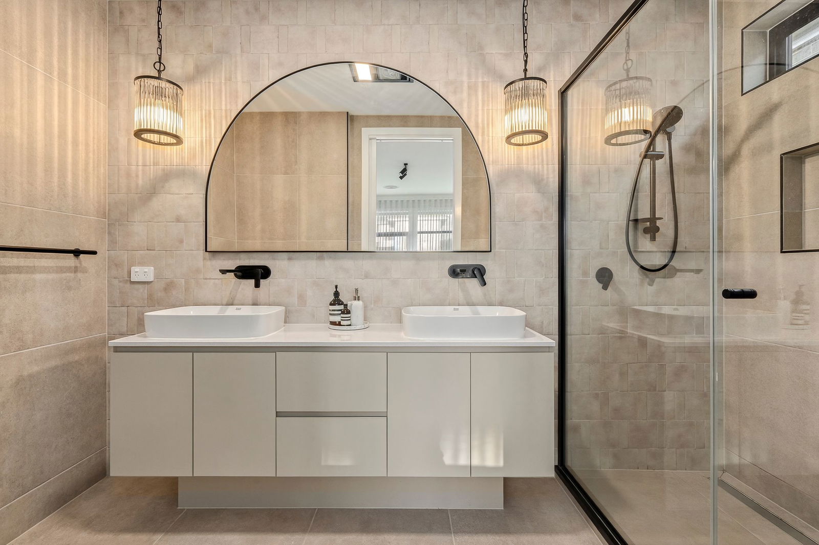 Master Suite: Double door entry, carpet underfoot, twin walk-in robes, sheer curtains and roller block-out blinds, pendant lighting, and ensuite with sliding door entry, floor-to-ceiling tiles, dual vanity with stone bench, arched mirror, black tapware, toilet, and shower with ceiling-mounted head and rail head, niche, and tiled base.