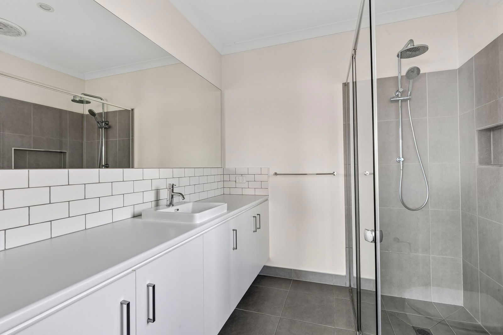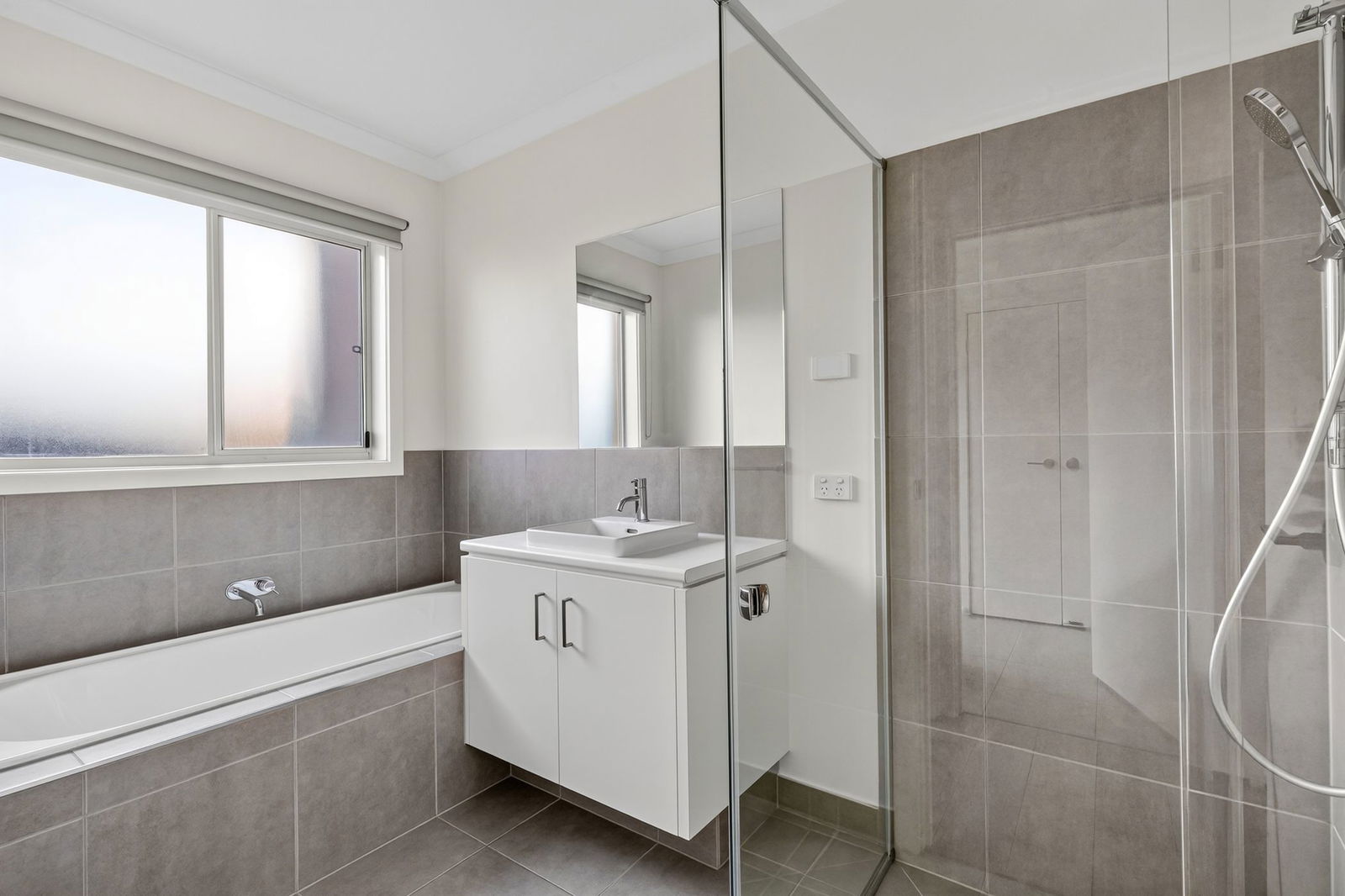 Main Bathroom: Shower with dual heads and tiled base, single vanity with underbench storage, built-in tub, window with roller blind, and separate toilet.