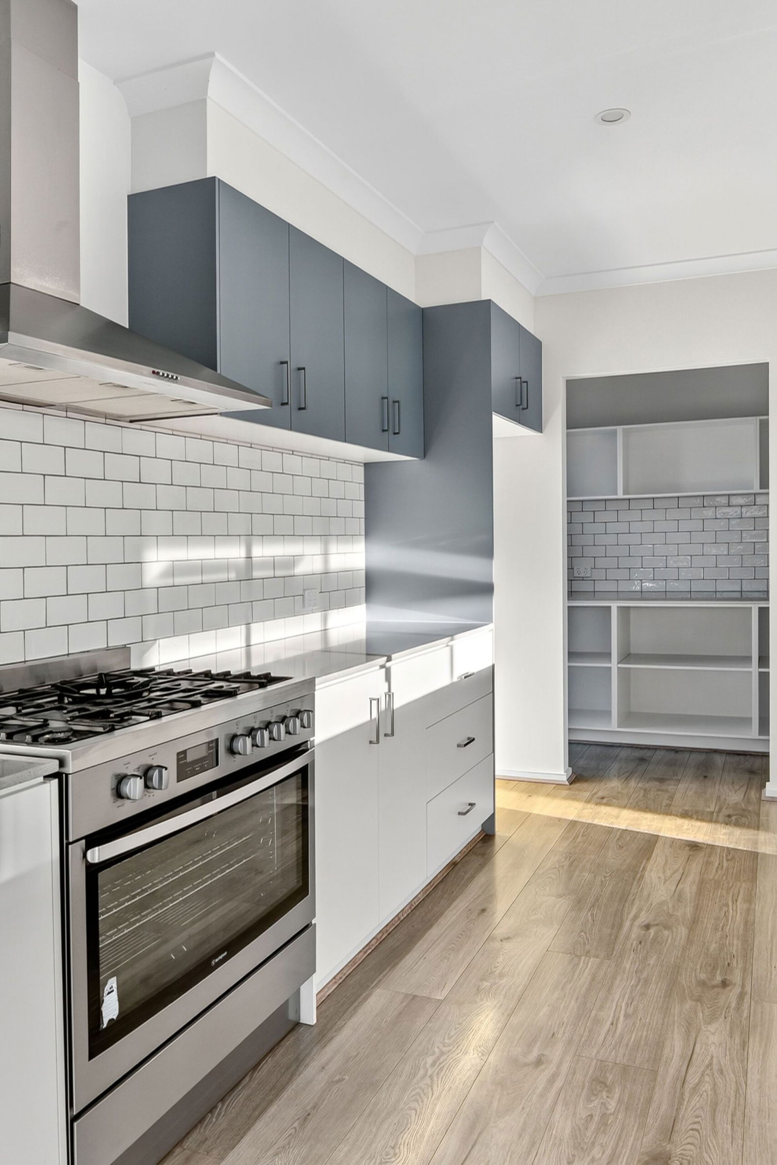 Kitchen: Walk-in pantry, ample cabinetry with two toned cupboards, subway tile splashback, stone benchtops, large island with dual sink and dishwasher, microwave cavity, Westinghouse dual-fuel cooker, canopy rangehood, and glass sliding door to the rear.