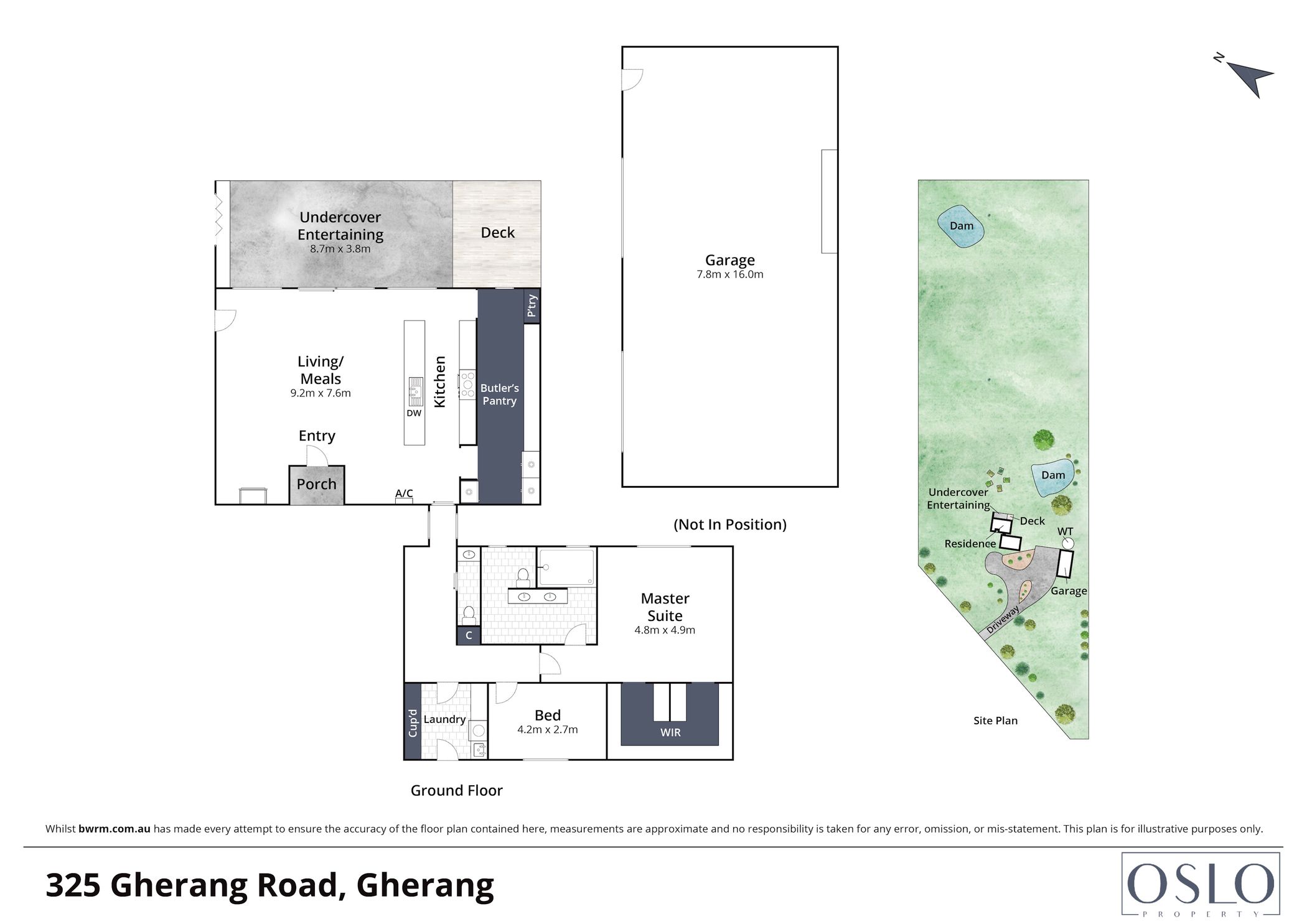 Outside: An acreage landscape introduced by an asphalt return driveway spans 3.57ha (approx.), where two large dams, a rear paddock, expansive 7.8x16m garage/shed, and veggie gardens provide a peaceful lifestyle like none other.
