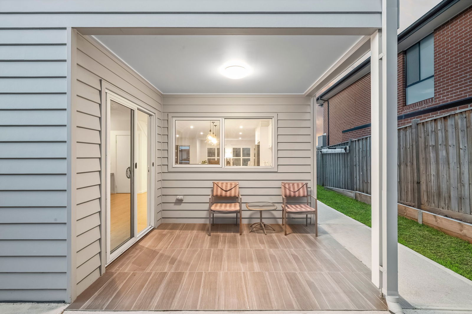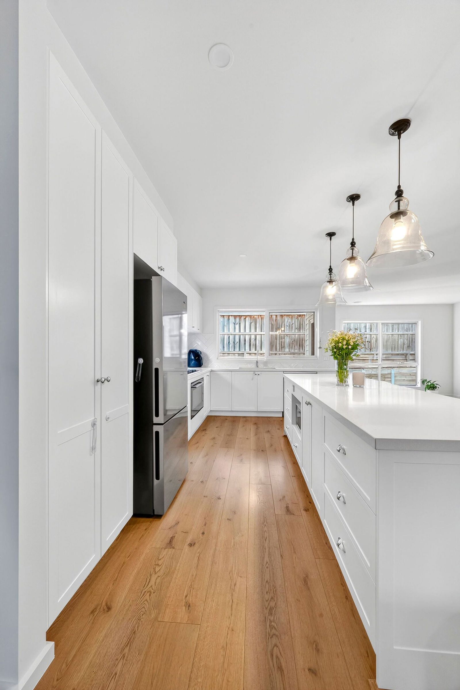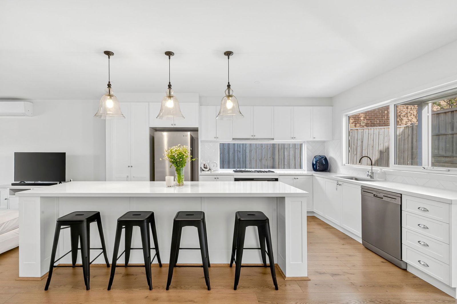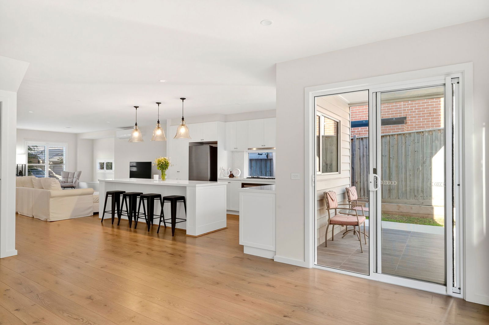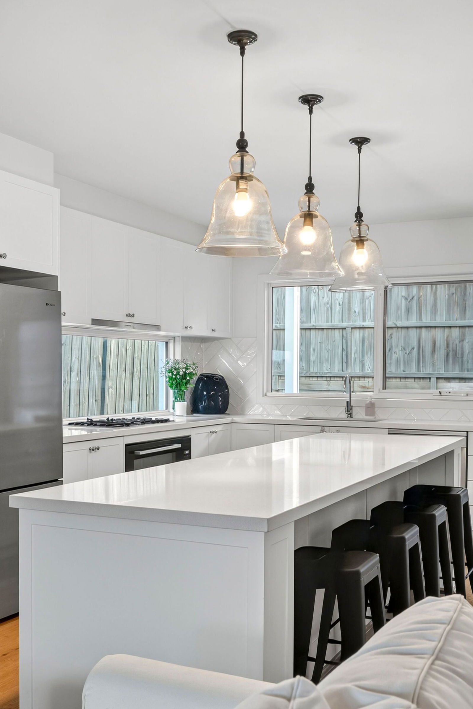 Kitchen/Dining – Quality built kitchen with crisp white, shaker style cabinetry, stone benchtops, high end appointments including an electric oven, gas cooktop & dishwasher, timber-look laminate flooring, downlights, glass pendant lights over the island bench, glass & tiled splashback, sliding door from dining to undercover alfresco and low maintenance back yard