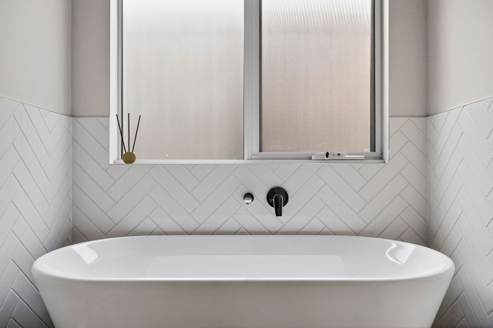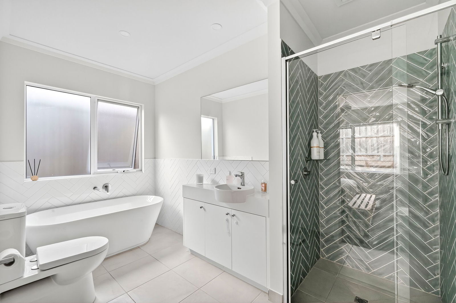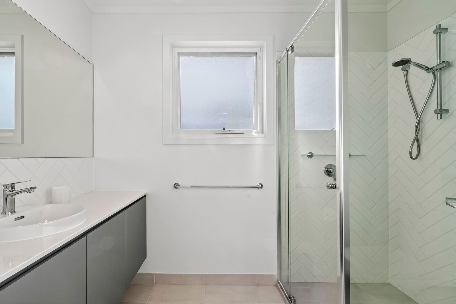 Main Bathroom – Spacious, sleek looking bathroom with large single vanity with mirror, feature herringbone laid tiles & shower