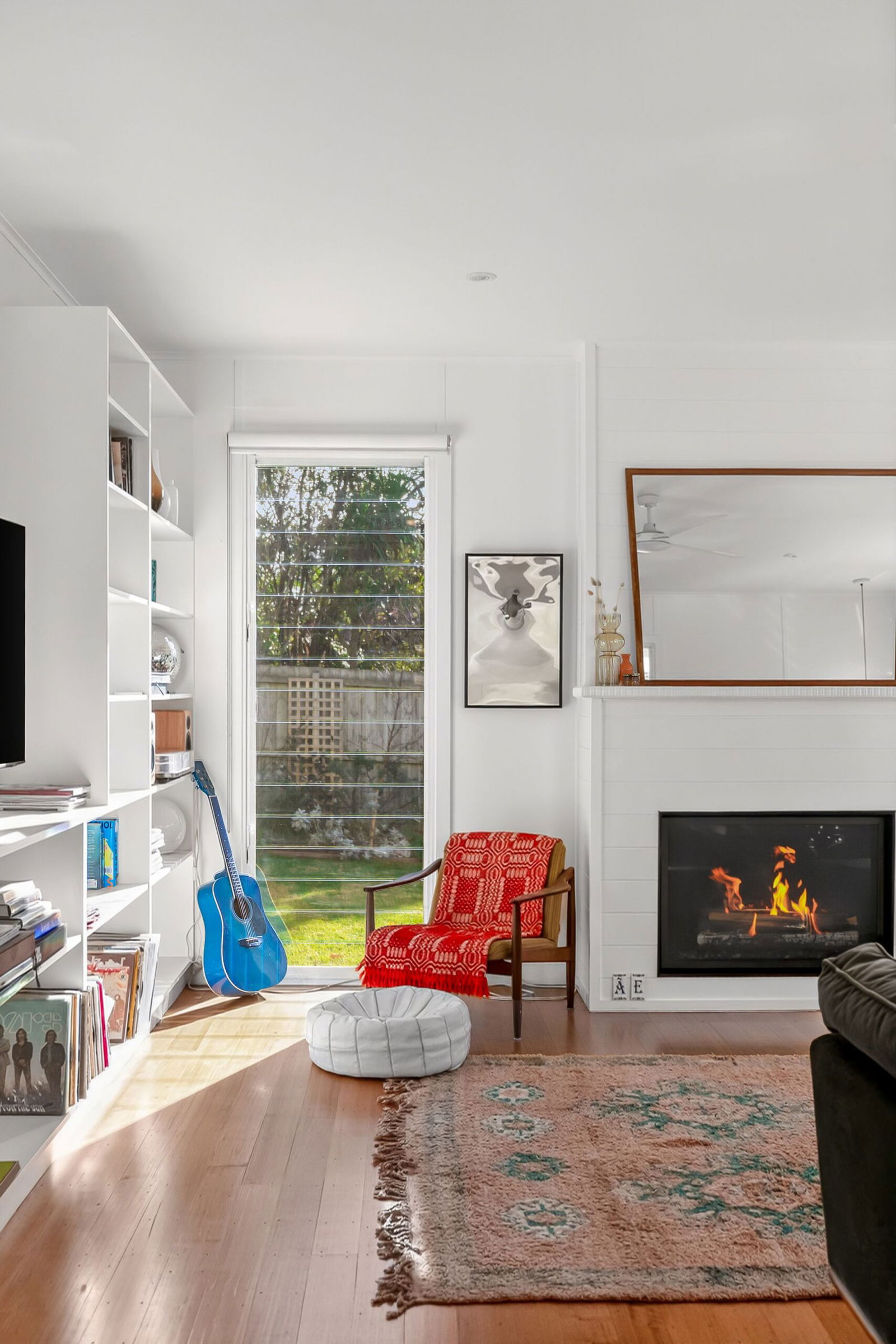 Living – Beautifully snug living room connected via a brightly-lit breezeway, bespoke floor to ceiling timber bookshelves, louvre windows, hardwood timber flooring, high ceilings, ceiling fan with light, downlights, feature pendant, roller blinds, gas log fire, direct access onto sunny north facing alfresco deck for additional entertaining