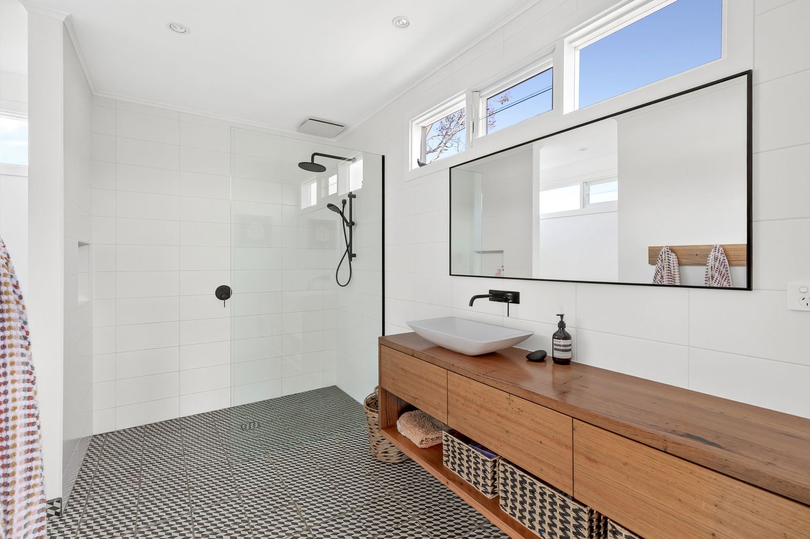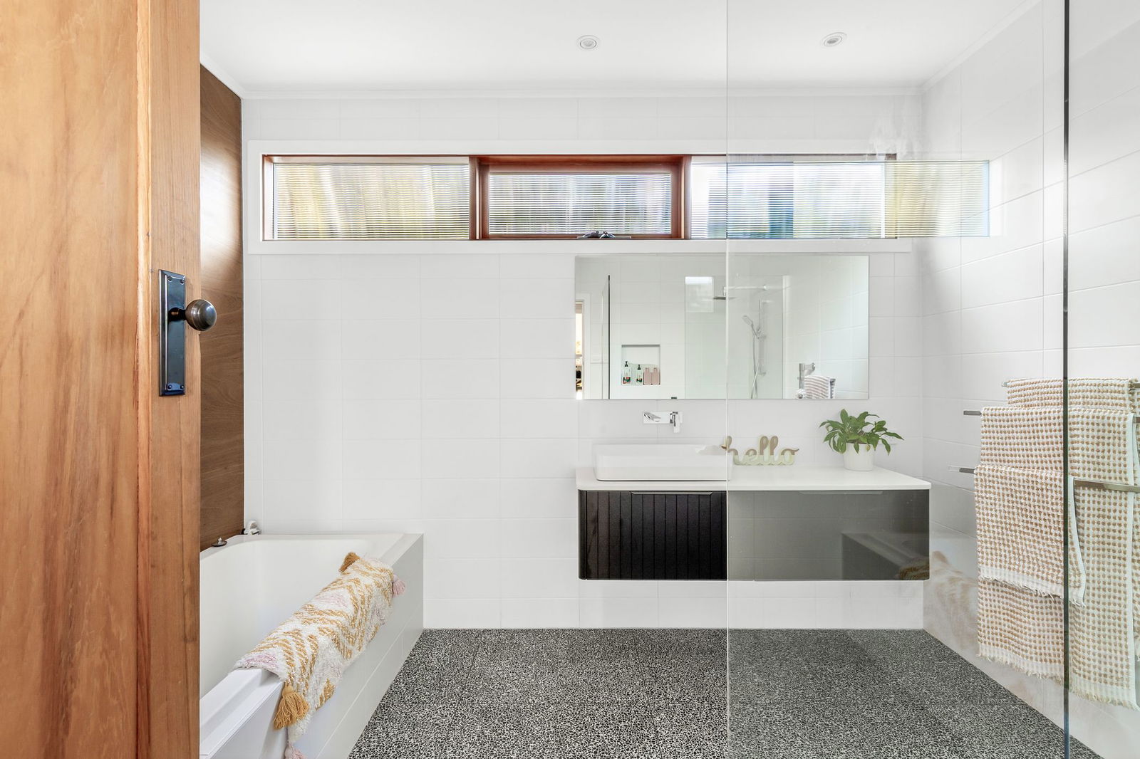 Main Bathroom – Masterfully modernised bathroom with Terrazzo look ceramic tiling, bath, contrasting black ribbed vanity & single basin, semi frameless shower, tiled shower niche and original Hardwood windows