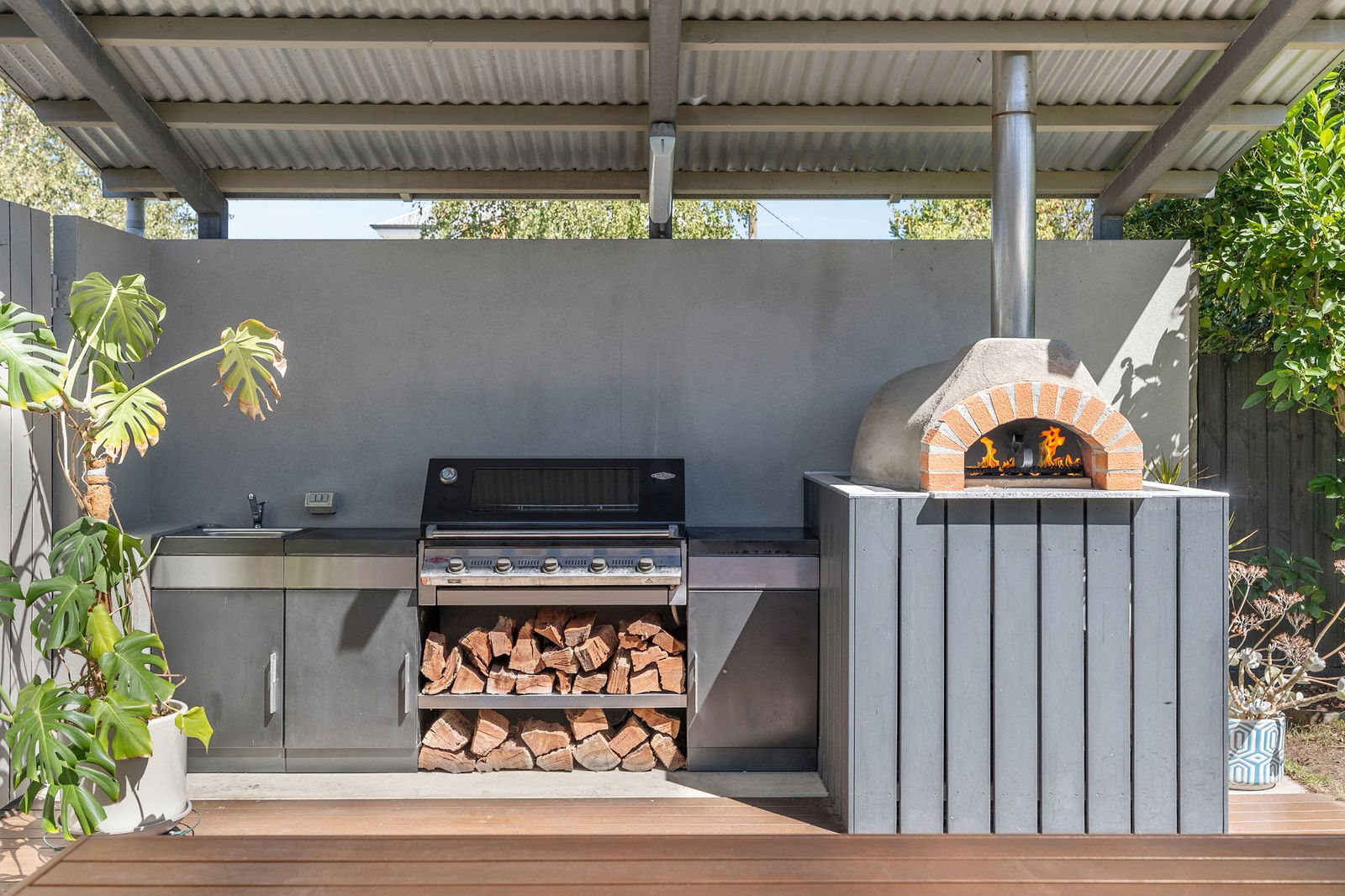 Outside: Fully leveraging its impressive 424sqm (approx.) space from corner to corner, this well-loved block seamlessly blends indoor and outdoor living, highlighted by a covered entertaining deck with an outdoor kitchen, featuring a built-in barbecue and a wood-fired pizza oven. A spacious grassy play area greets children at the back, featuring a cubby house, sandpit, veggie patch, and water tank, perfectly suited for practical families.