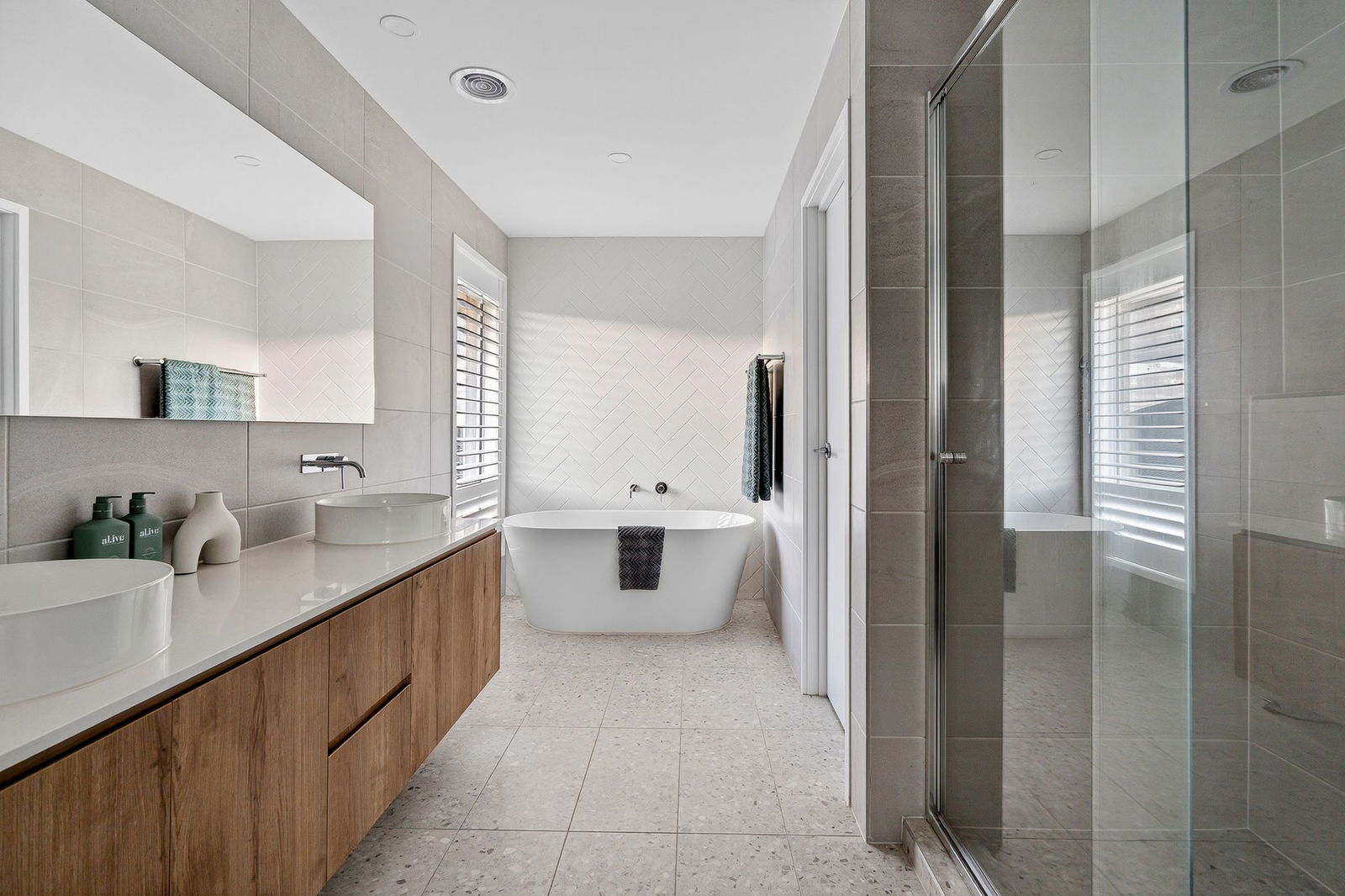 Main Bathroom: Full-height tiling, a floating vanity with underbench drawers, wall mirror, an oversized shower with rail head, feature tub, and separate toilet.