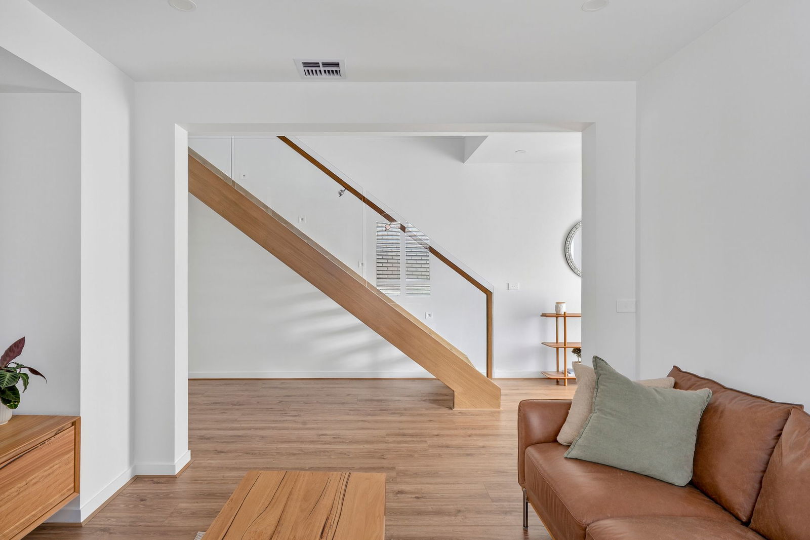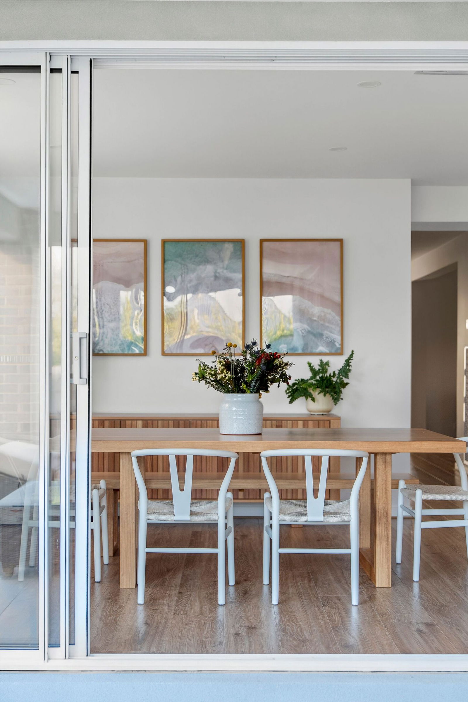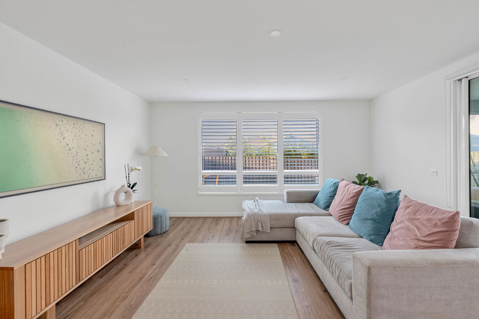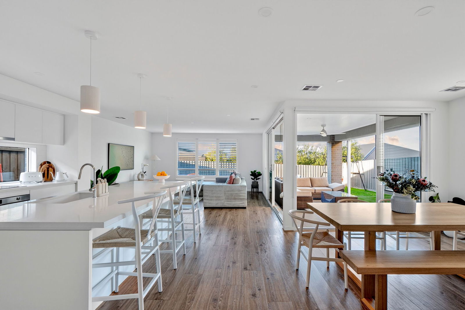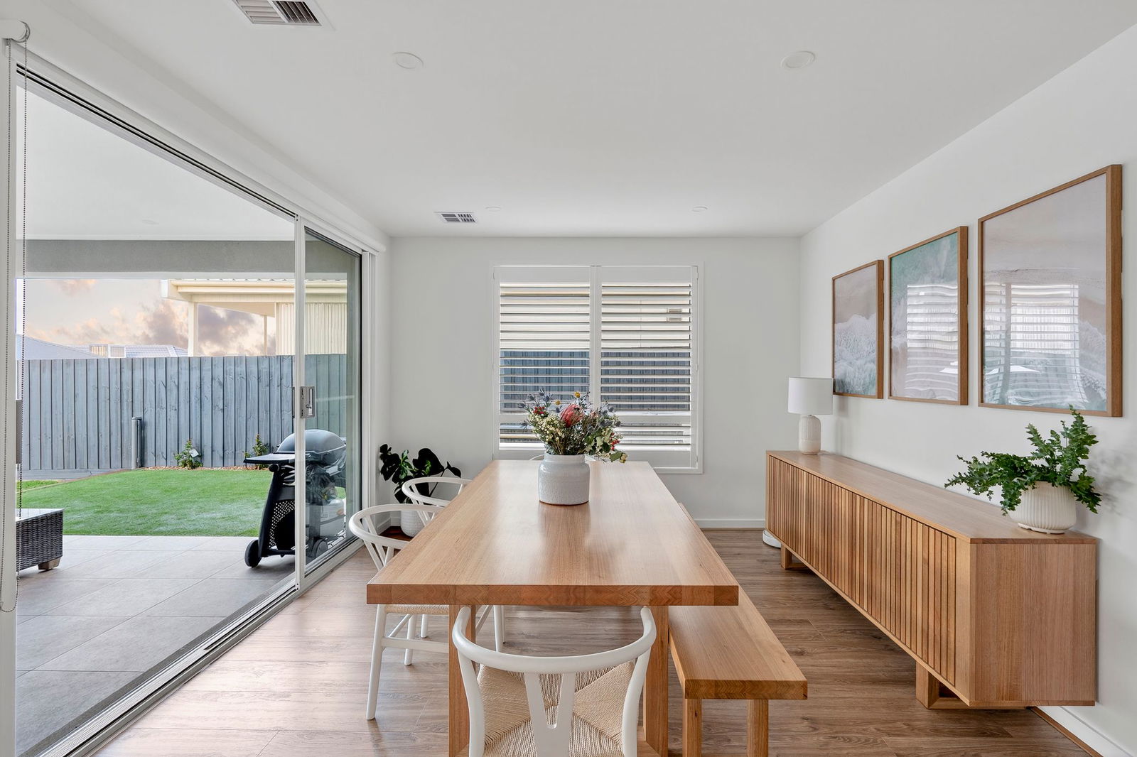 Living/Dining: Engineered timber floors, windows with plantation shutters, downlights, and twin stackers to covered alfresco.