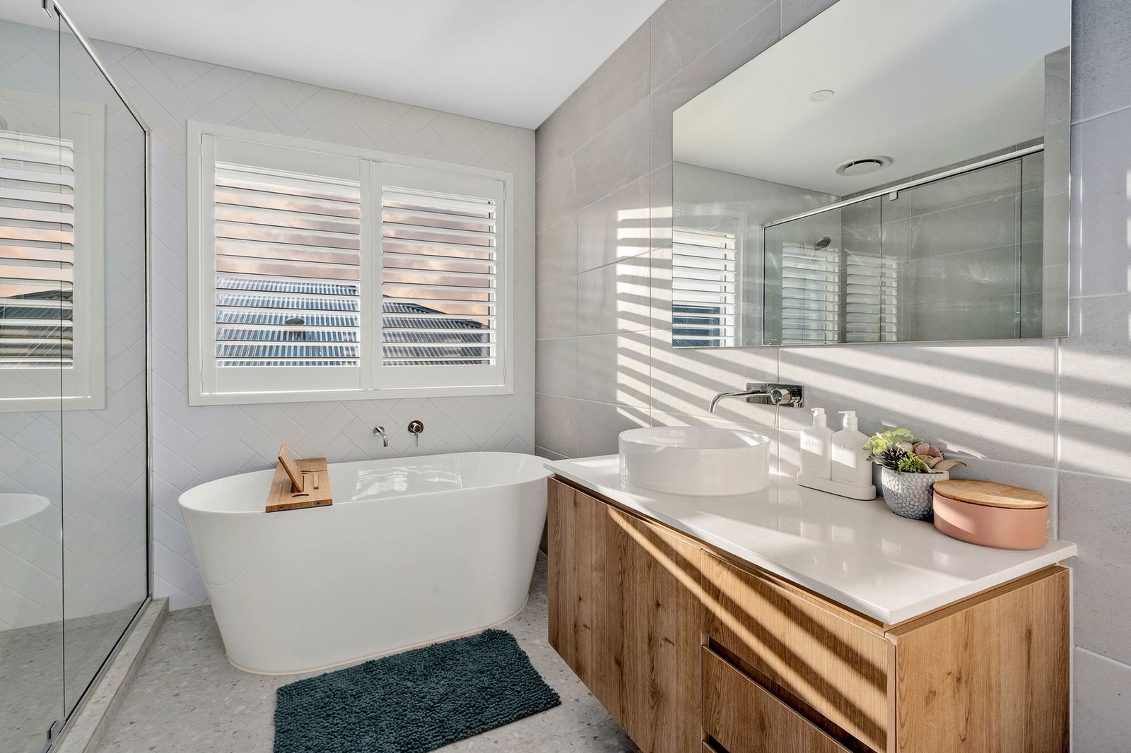 Master Suite: Spacious proportions, carpet underfoot, sliding door access to private balcony, windows with elevated street aspects and plantation shutters, downlights, and fully-fitted walk-in robe. Cavity slider entry to ensuite, with oversized shower with double heads and tiled base, feature tub, floating dual vanity with underbench drawers, mirror, toilet, and full-height tiling.