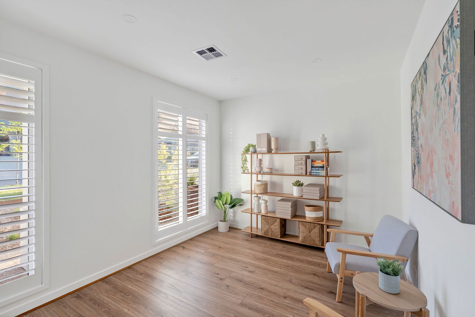 Secondary Lounge: First floor position with carpet underfoot, windows with plantation shutters, downlights, and recessed entertainment area.