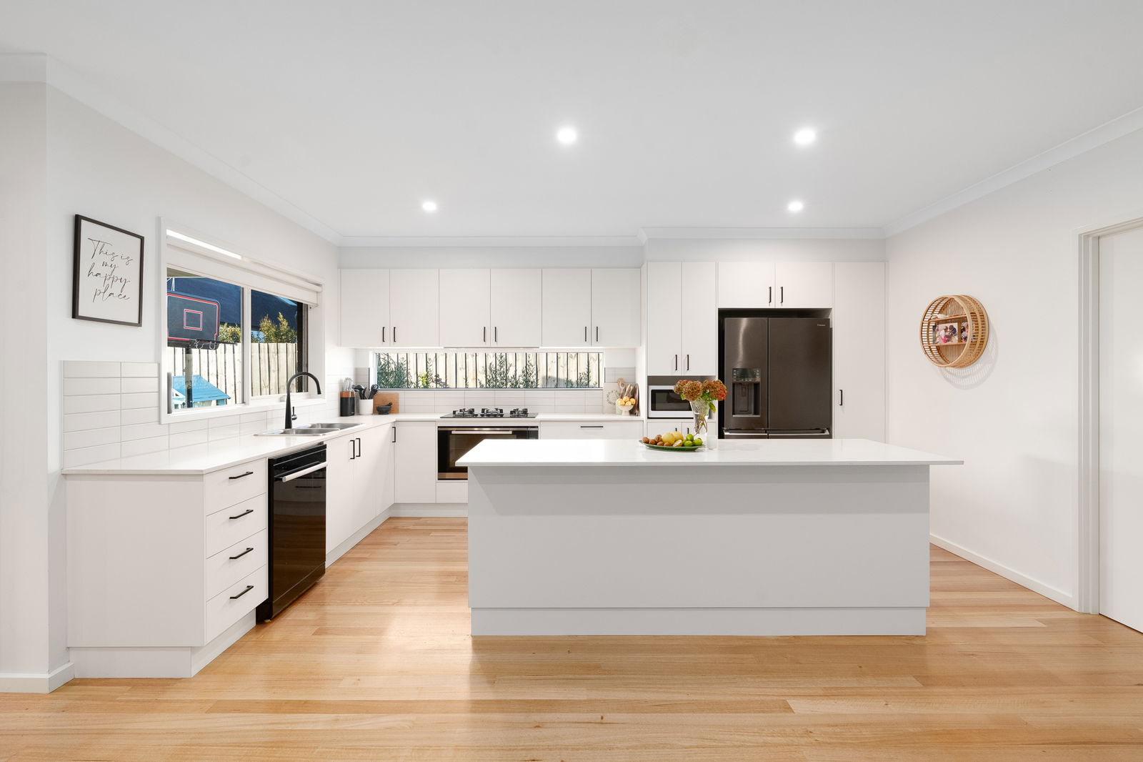 Kitchen: Stone island benchtops, premium appliances including gas cooktop and electric oven, double sink, abundant cabinetry with sleek black hardware, subway tile splashback, dishwasher, generous walk-in pantry, overhead cupboards, LED lighting, and views across the alfresco and garden.