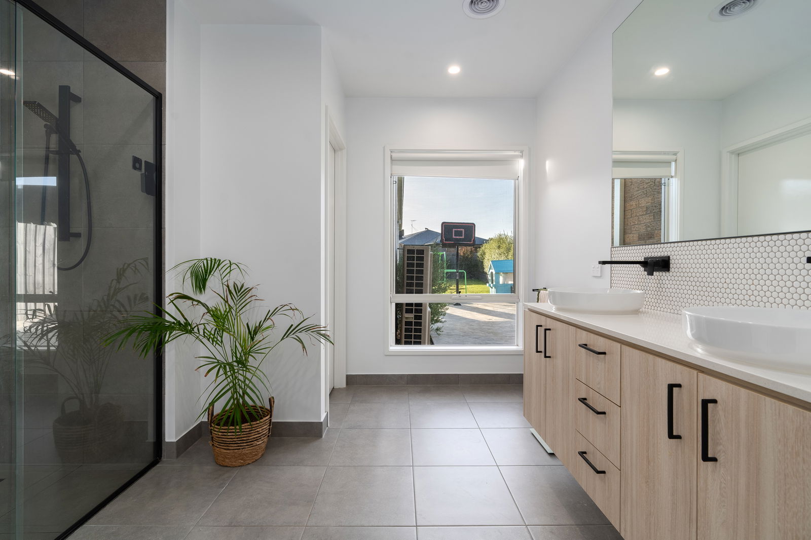 Main Bedroom: King-sized bedroom with dual walk-in robes, carpet underfoot, large windows with soft diffused light, and a modern ensuite with oversized shower, vanity with underbench storage, tiled niche, quality tapware, and toilet.