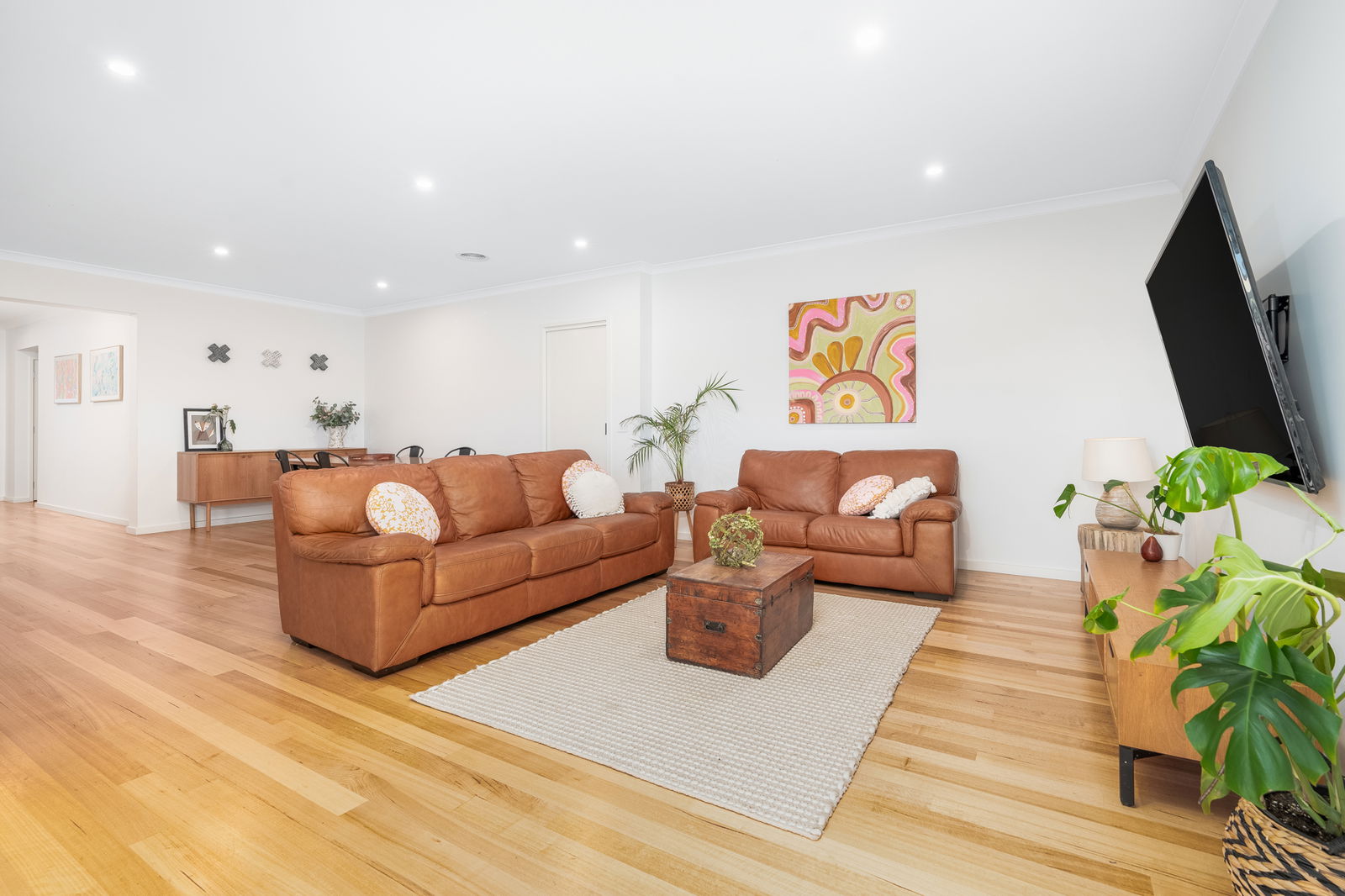 Open Plan Living/Dining: Tassie Oak timber floors, large windows delivering abundant natural light, sliding doors connecting to the alfresco, ducted zoned heating and cooling, LED downlights, expansive dining space, and a spacious family living zone perfect for gatherings.