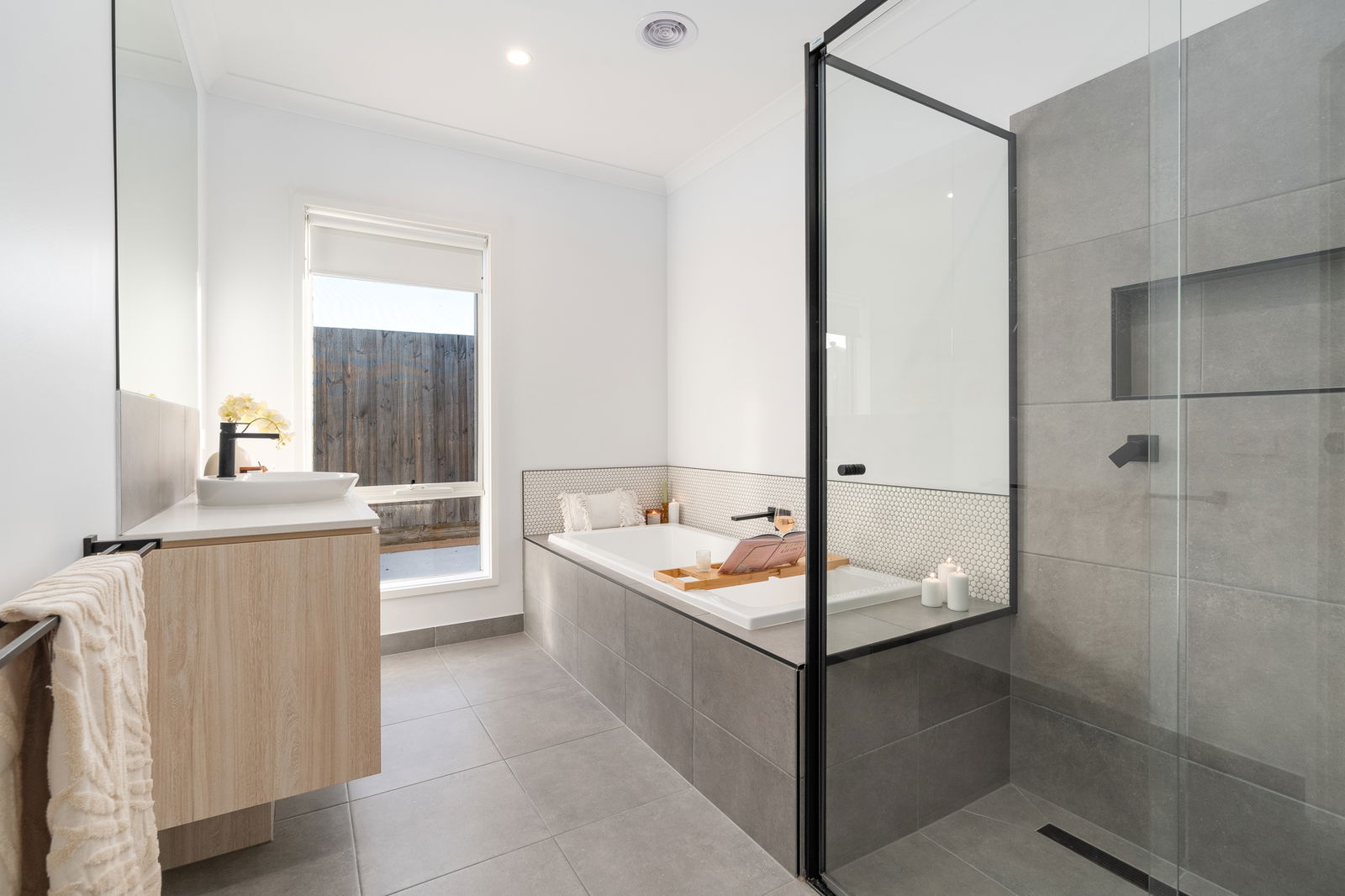 Main Bathroom: Deep built-in bathtub, large shower with tiled niche, modern vanity with storage, contemporary tiling, and separate toilet for convenience.