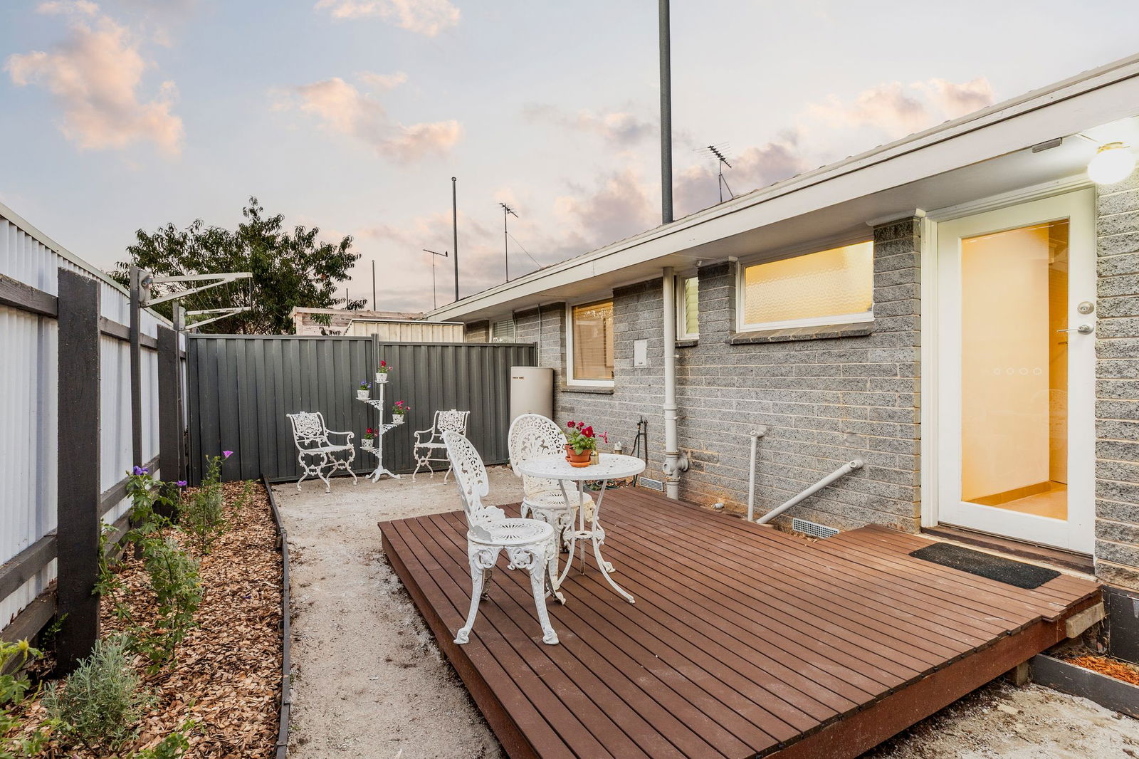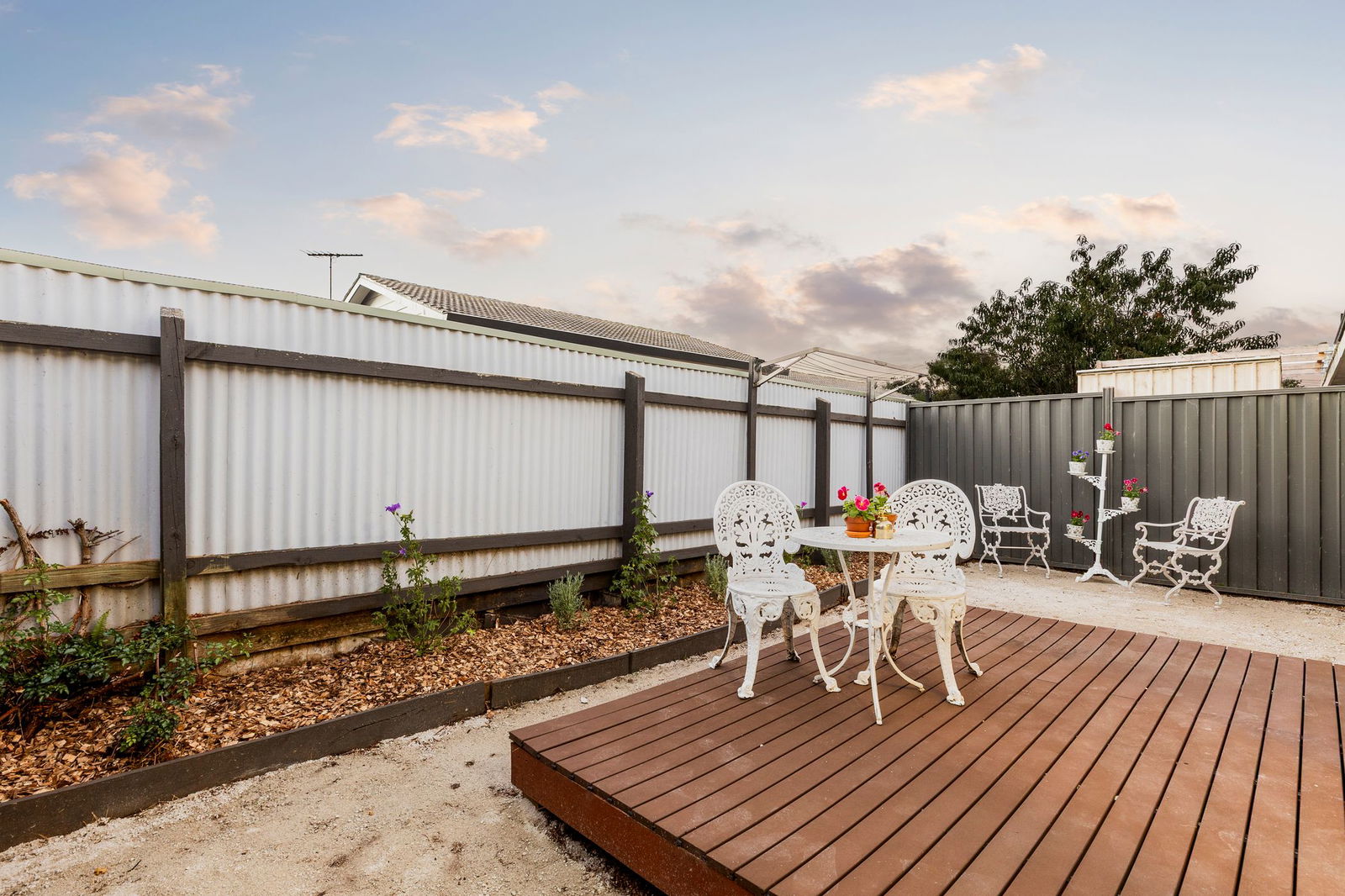 Outside: Completely secure and almost no maintenance, the secure courtyard with elevated sun-kissed deck welcomes private outdoor entertaining space alongside a bordered garden. With a rear north-west orientation and a single carport, the easy-care allotment keeps privacy and peace a priority.