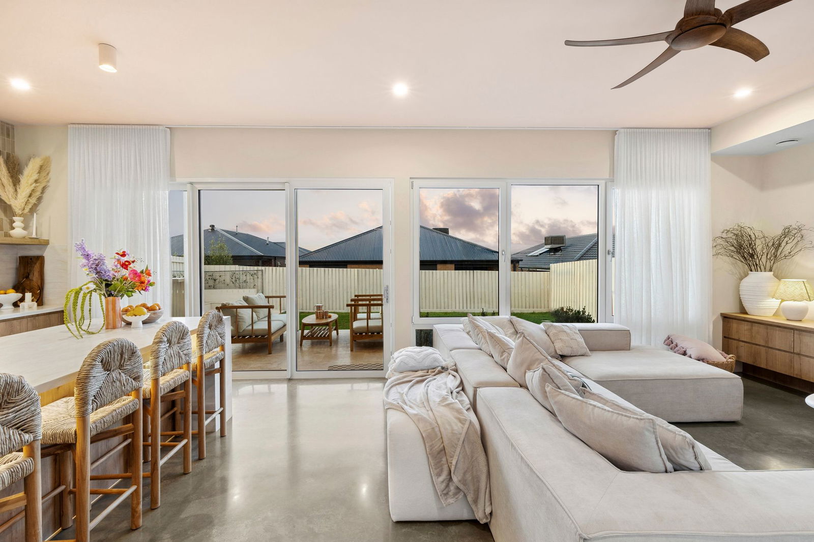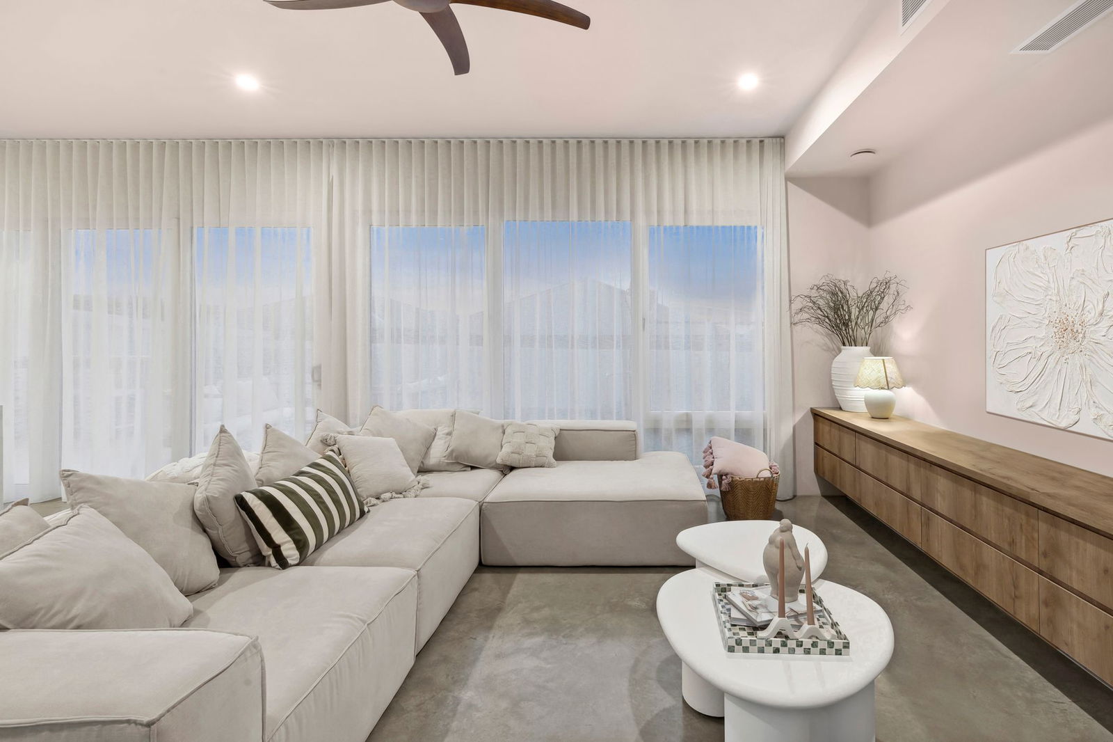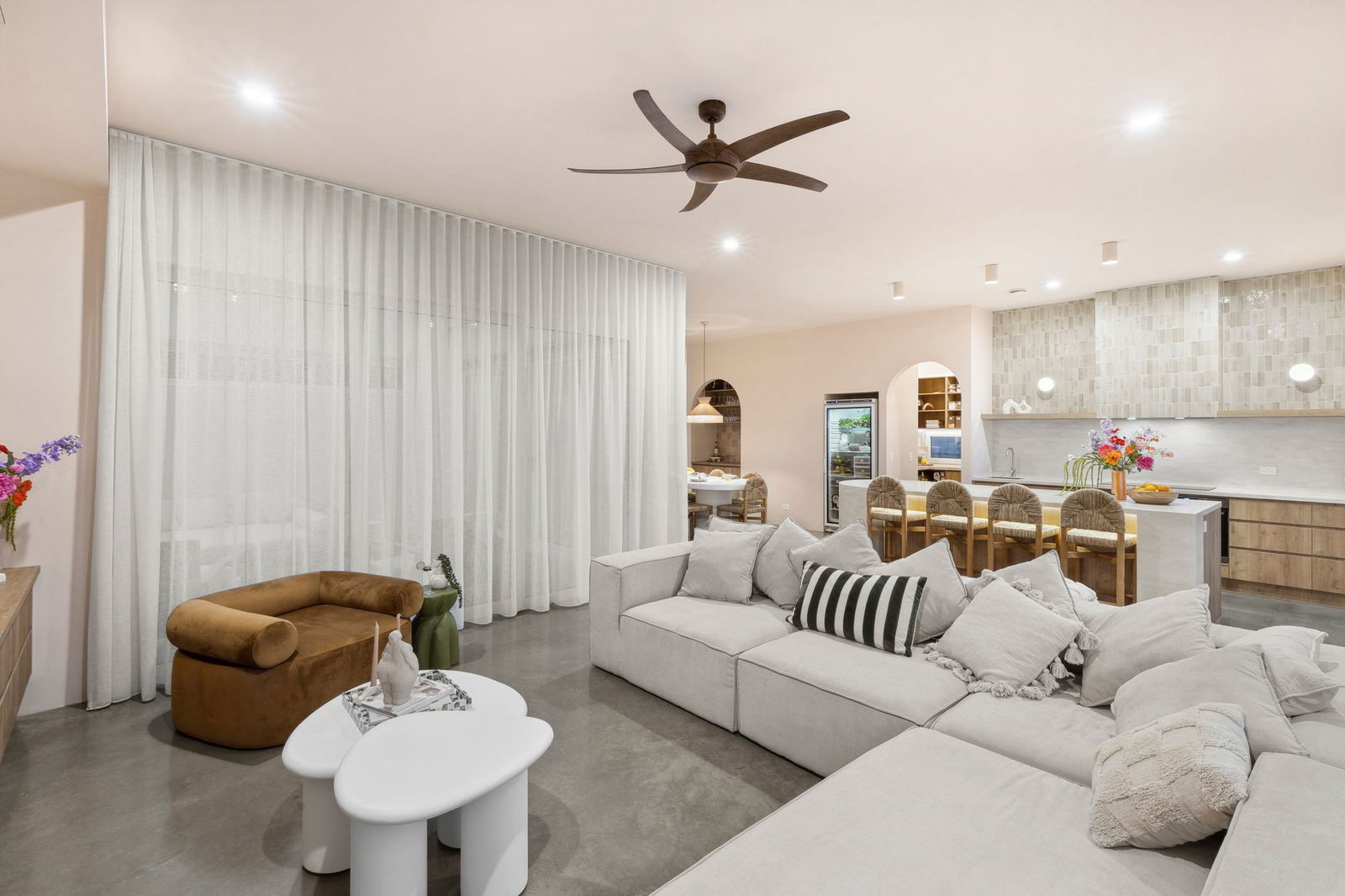 Living/Dining: Polished concrete floors, custom joinery, ceiling fan, twin dining pendants, custom full-height sheer curtains, natural Santa Cruz stone feature wall, and glass doors to deck alfresco. Flush ridge cavity, and dedicated bar with arched entryway.