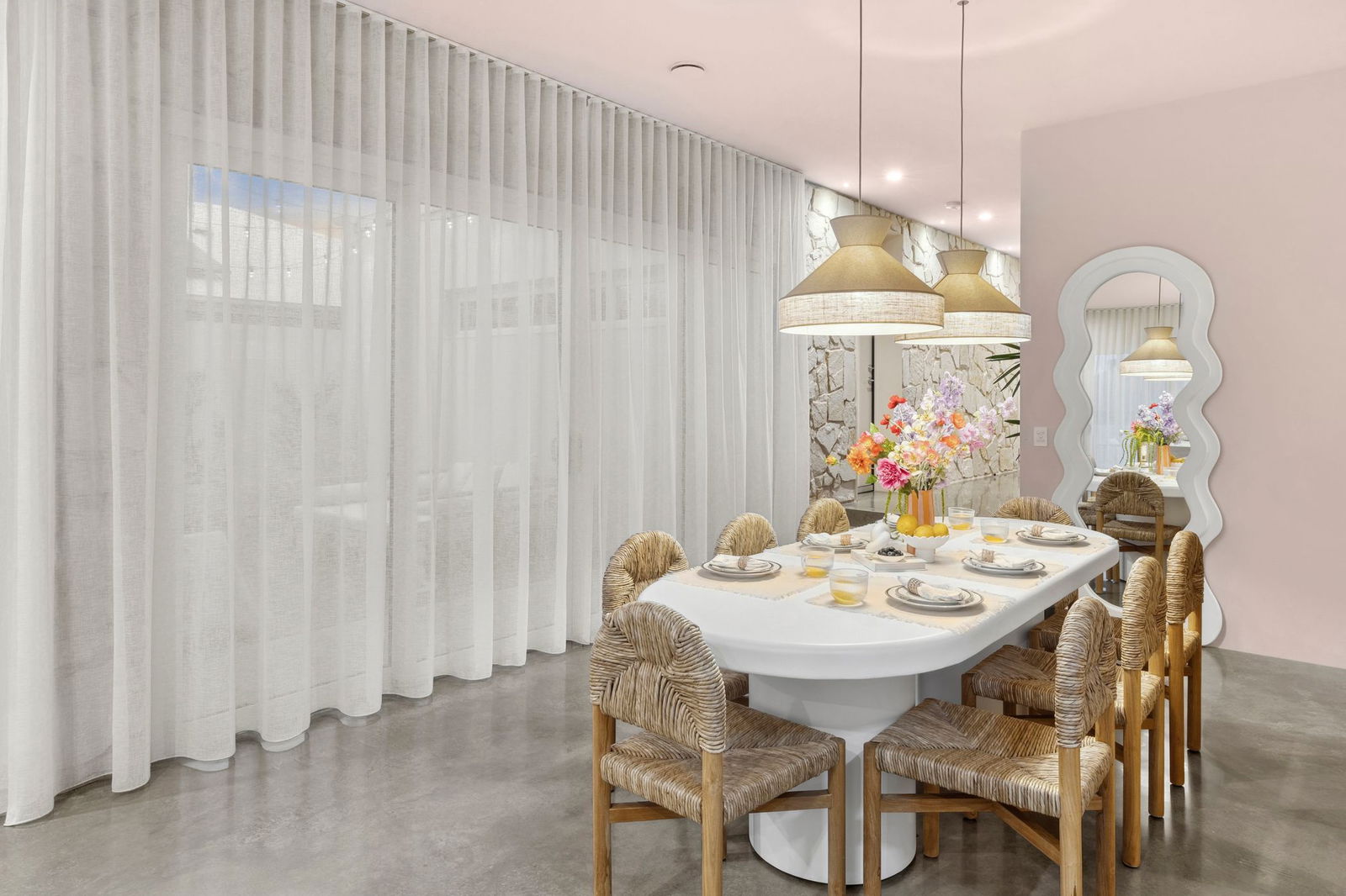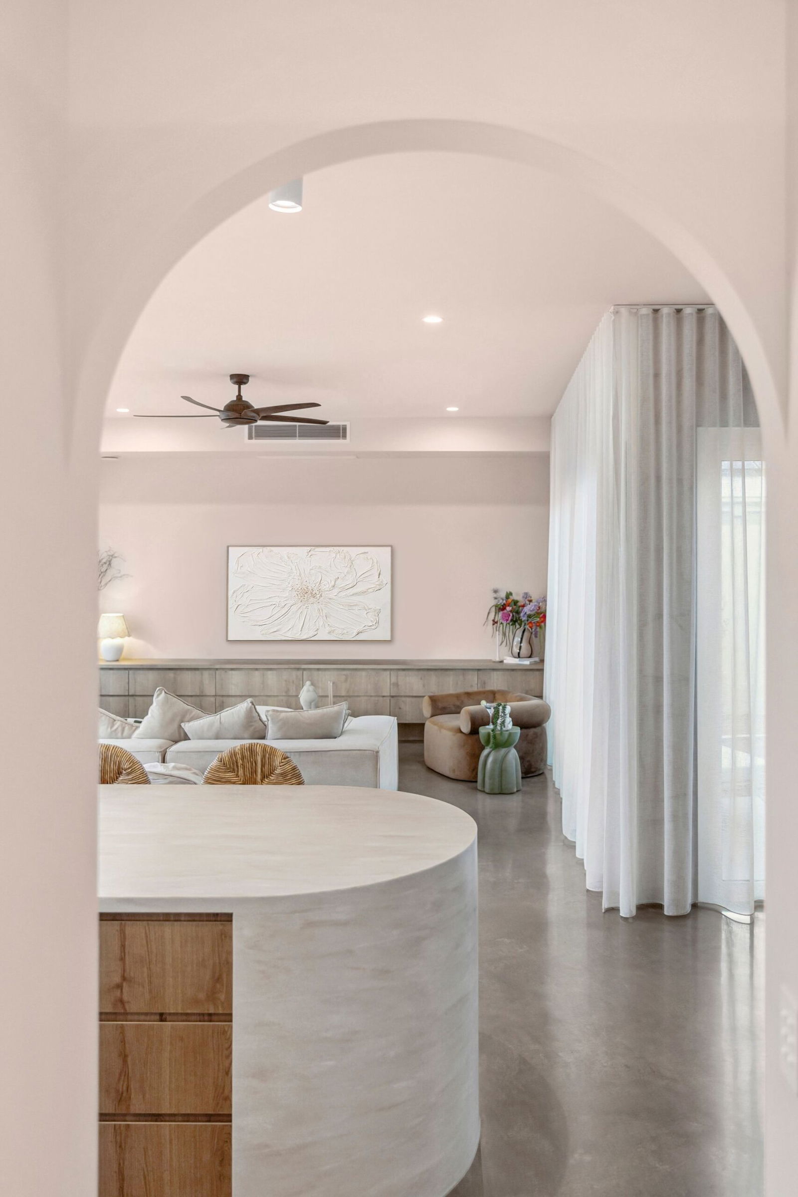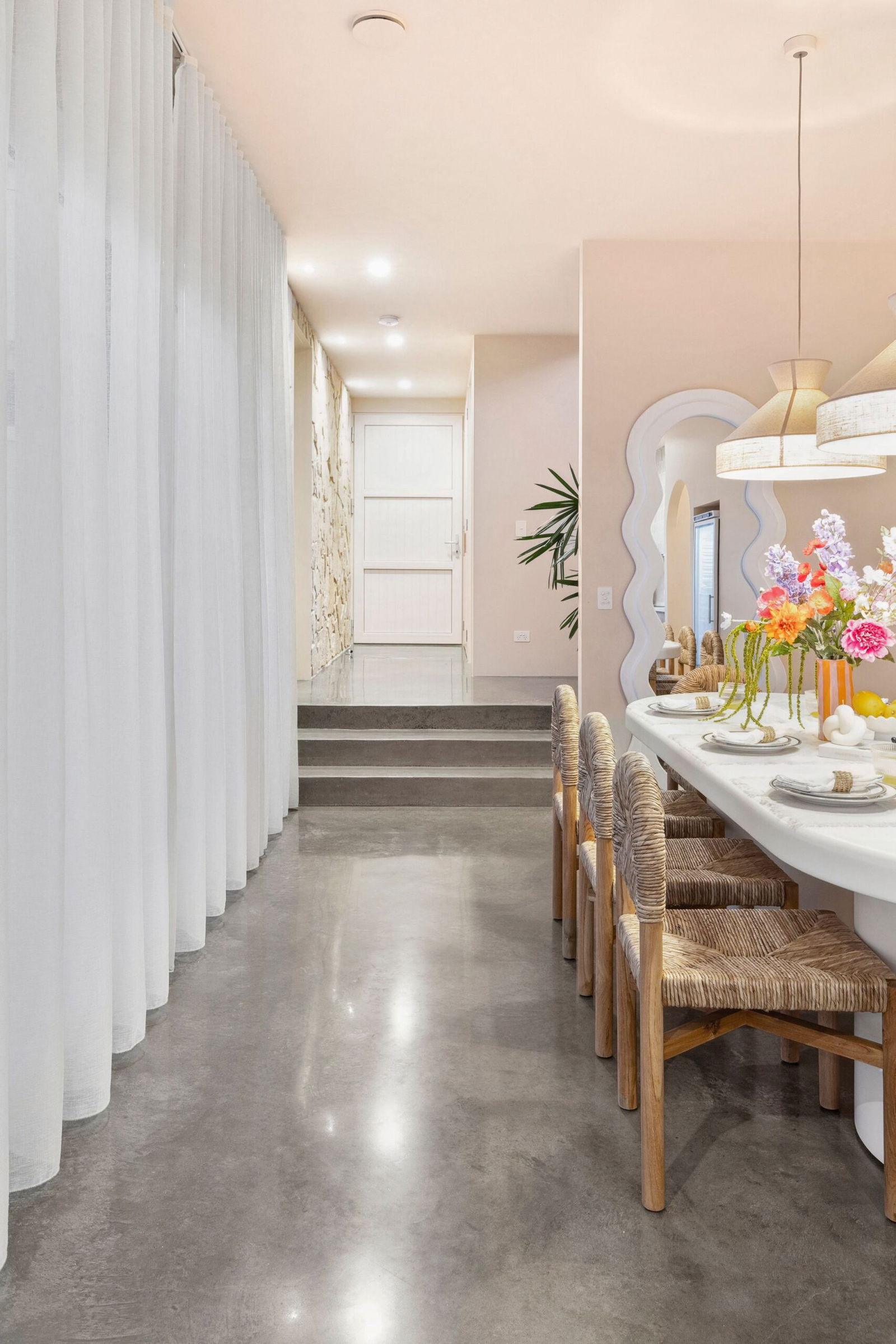 Living/Dining: Polished concrete floors, custom joinery, ceiling fan, twin dining pendants, custom full-height sheer curtains, natural Santa Cruz stone feature wall, and glass doors to deck alfresco. Flush ridge cavity, and dedicated bar with arched entryway.