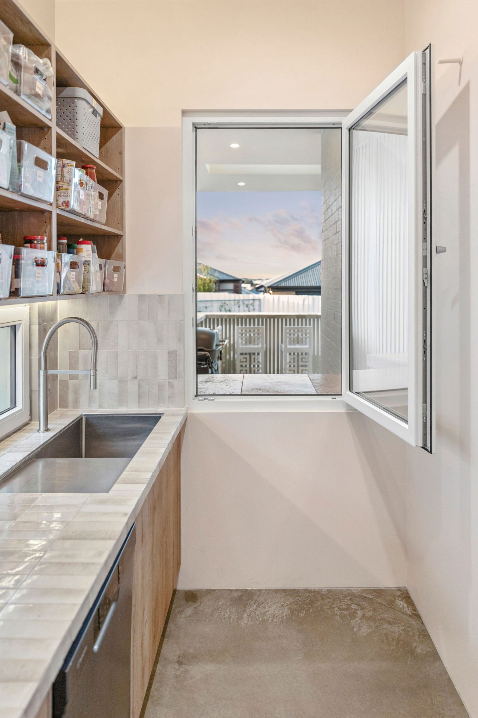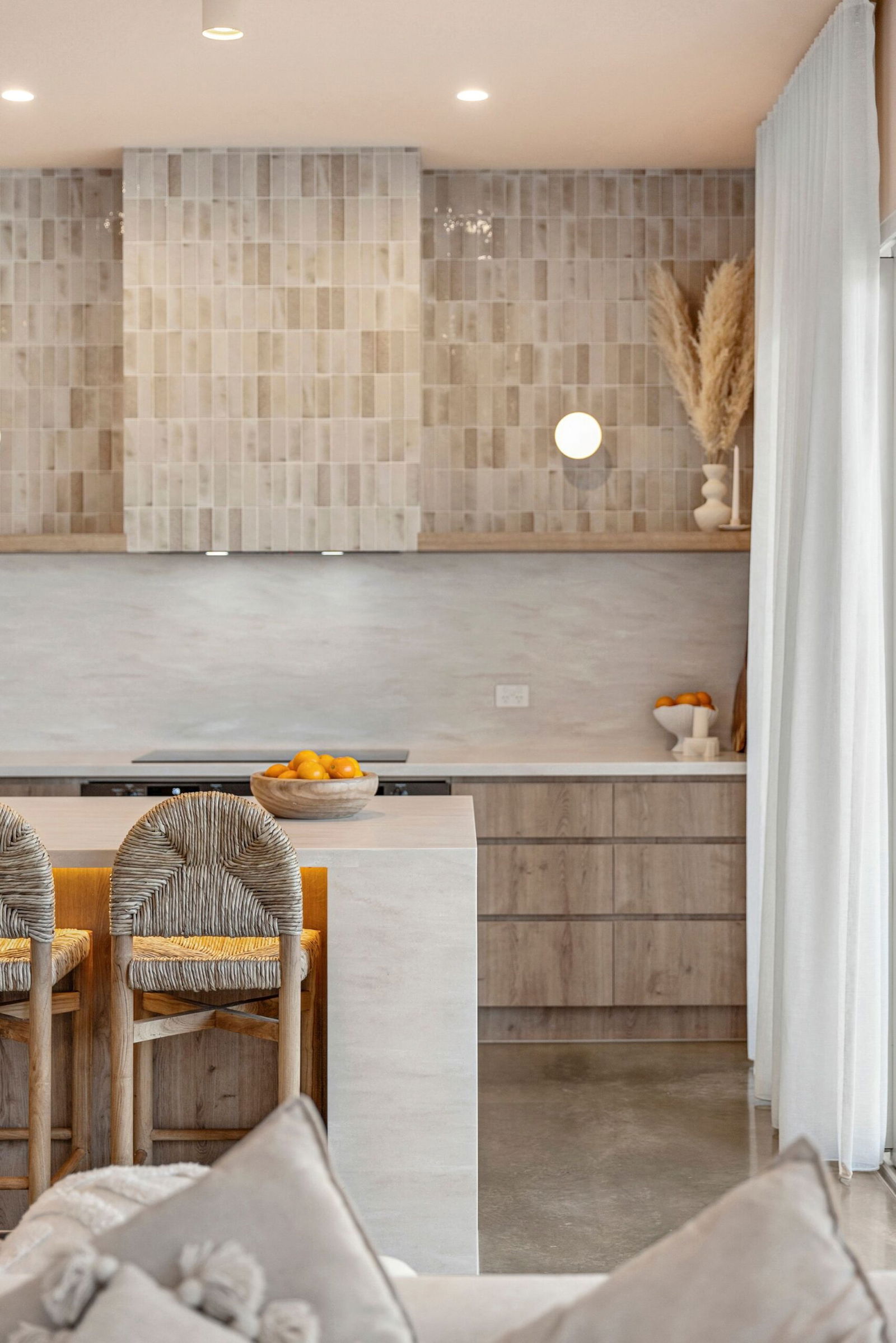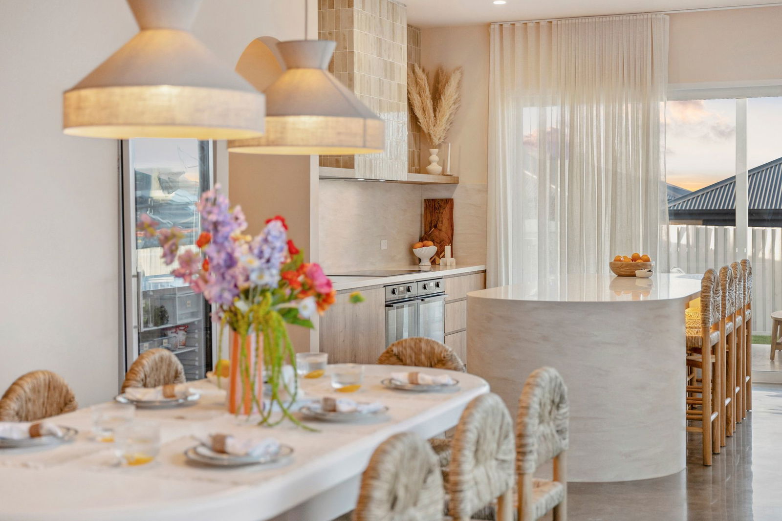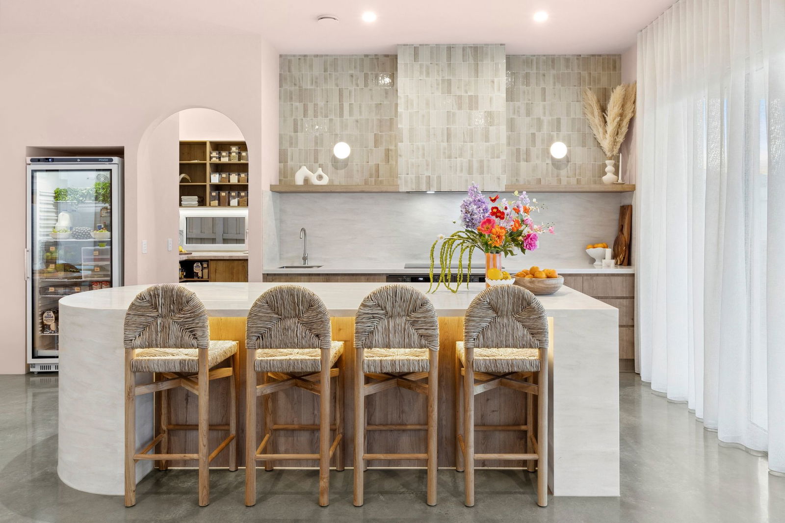 Kitchen: Butler’s pantry with arched entry, dishwasher, splashback window, secondary sink, exterior pass-through window, open shelving, and custom joinery. Dual Westinghouse underbench ovens, an induction cooktop, stone benchtops, tiled splashback, handcrafted Italian-imported feature tiling with open shelves, curved island bench with breakfast bar, ceiling mounted downlights, stacker doors to deck alfresco, custom full-height sheer curtains, in-set sink with brushed chrome tapware.
