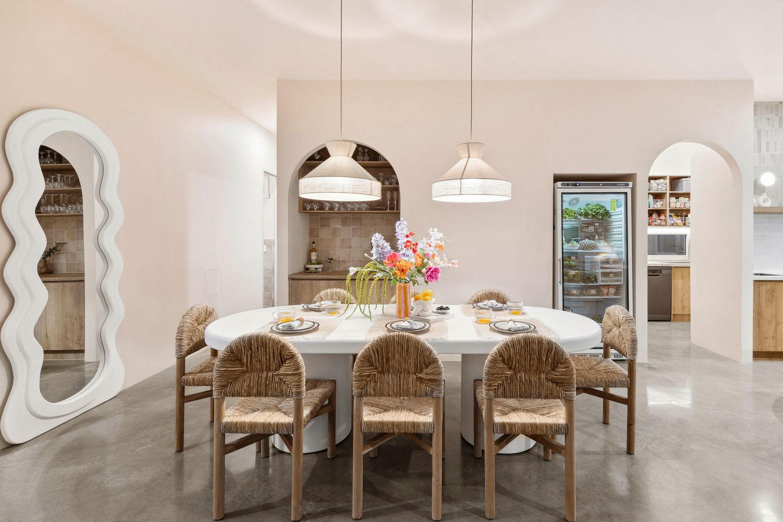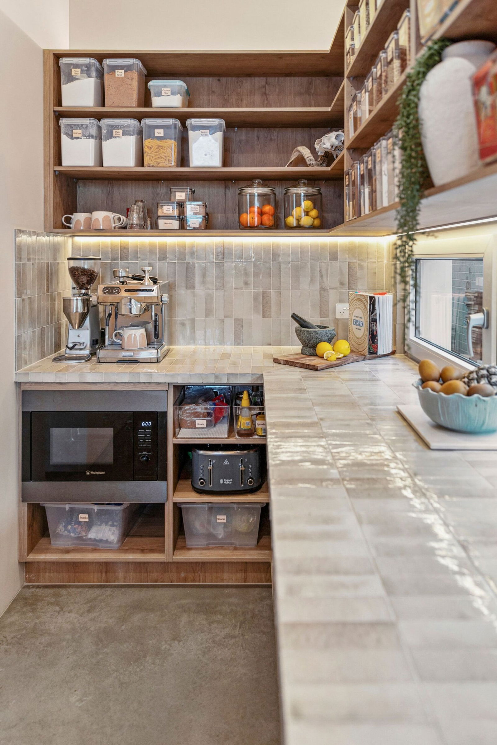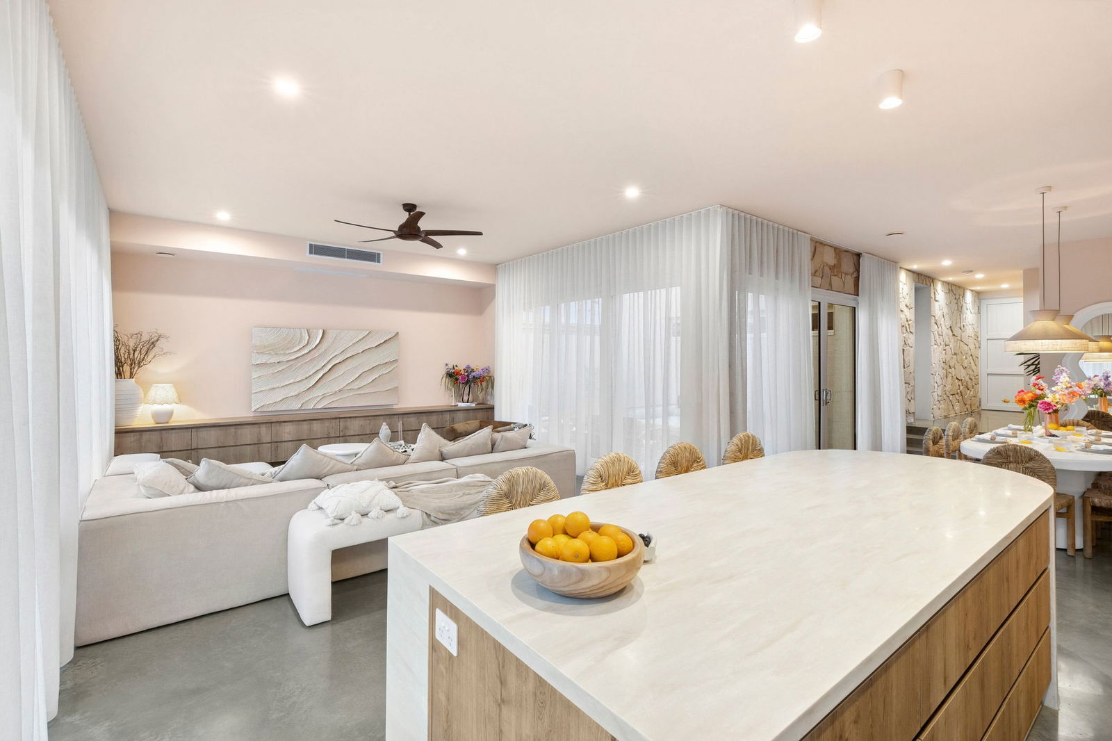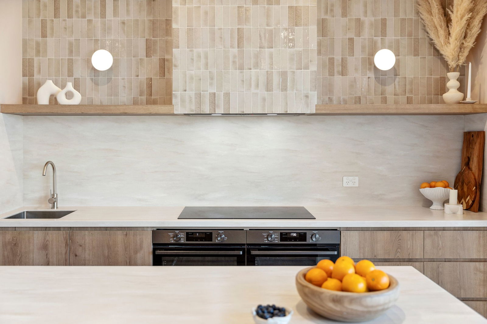 Kitchen: Butler’s pantry with arched entry, dishwasher, splashback window, secondary sink, exterior pass-through window, open shelving, and custom joinery. Dual Westinghouse underbench ovens, an induction cooktop, stone benchtops, tiled splashback, handcrafted Italian-imported feature tiling with open shelves, curved island bench with breakfast bar, ceiling mounted downlights, stacker doors to deck alfresco, custom full-height sheer curtains, in-set sink with brushed chrome tapware.