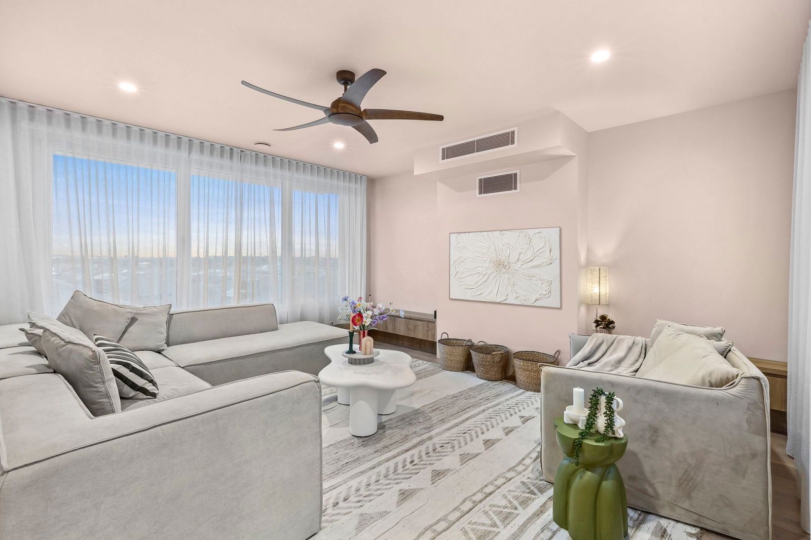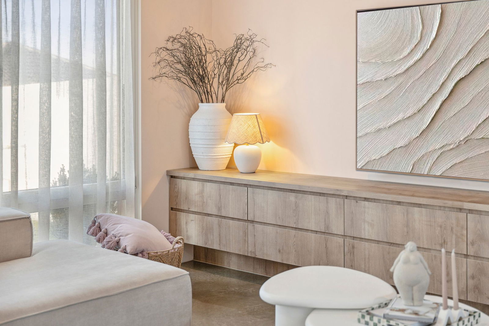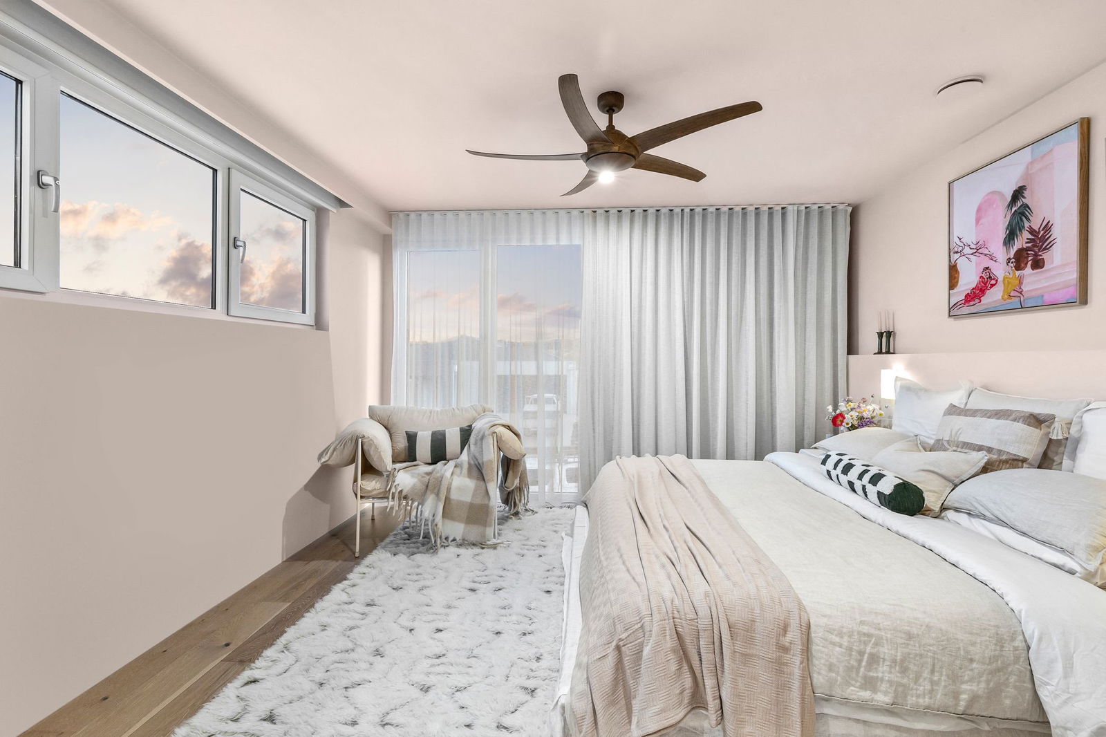 Secondary Living: Picture windows with custom sheer curtains and roller blinds, custom joinery, ceiling fan, downlights, and engineered European oak floors.